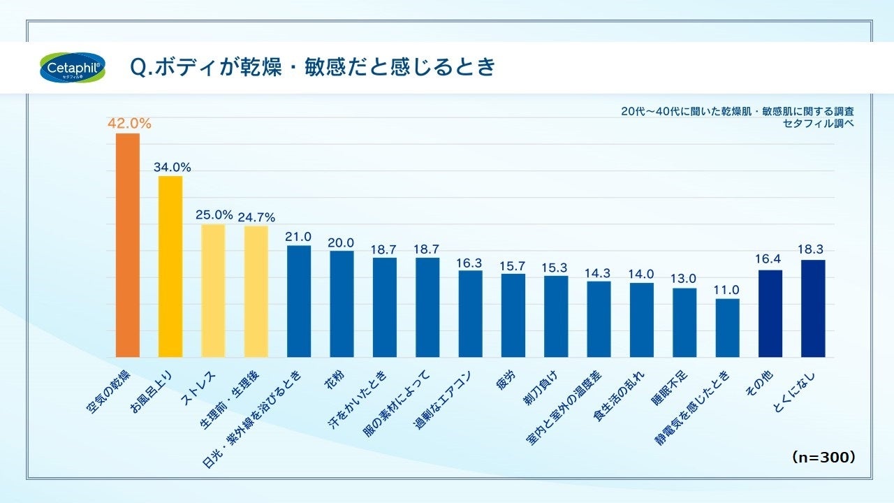 セタフィル®ブランドマーケティングマネージャーの桃谷由佳より「セタフィル®」の新キャンペーンを発表し、セタフィルブランドミューズである佐久間由衣さんご自身の“絶好調でいられる秘密”や美容皮膚科医の上原恵理先生に20代~40代の女性300名に聞いた、フェイス&ボディの乾燥・敏感肌のお悩みに関するトークセッションなどが行われました。アンケート内の「ボディが乾燥・敏感だと感じるとき」という質問では「空気の乾燥」が最多の42.0%となり、セタフィルファン・とみりーさんは、「1年中、冷房や暖房がついていたりするので乾燥は気になります。直接風にあたるところはなるべく避けるように気をつけています。」と回答すると、上原先生は「肌の湿度よりも、空気の湿度が低くなると、水分が湿度の低い方に流れます。すると、肌の水分がとられてしまい、肌のバリア機能が損なわれ、トラブルが起きやすく、より乾燥しやすくなります。そしてアンケートで意外と多かった「お風呂上り」。お風呂上りも同じようにケアをしないと逆に乾燥してしまうので注意しましょう。」とアドバイスしました。