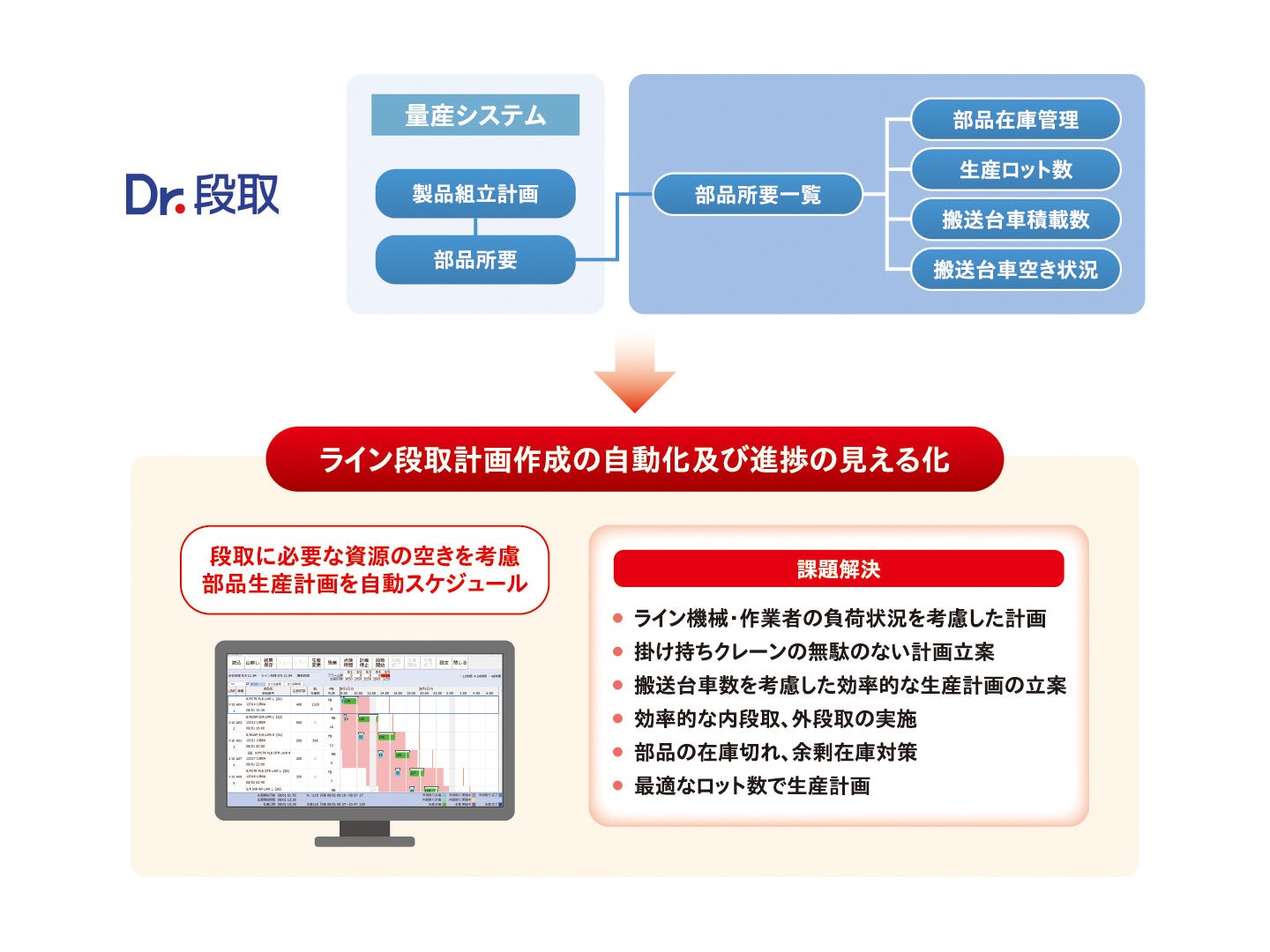 Dr.段取は、「段取りとスケジュール」で9割決まるともいわれる大型部品生産ラインの効率化に貢献する為のスケジューラであり、主に以下に貢献する事を目的としております。