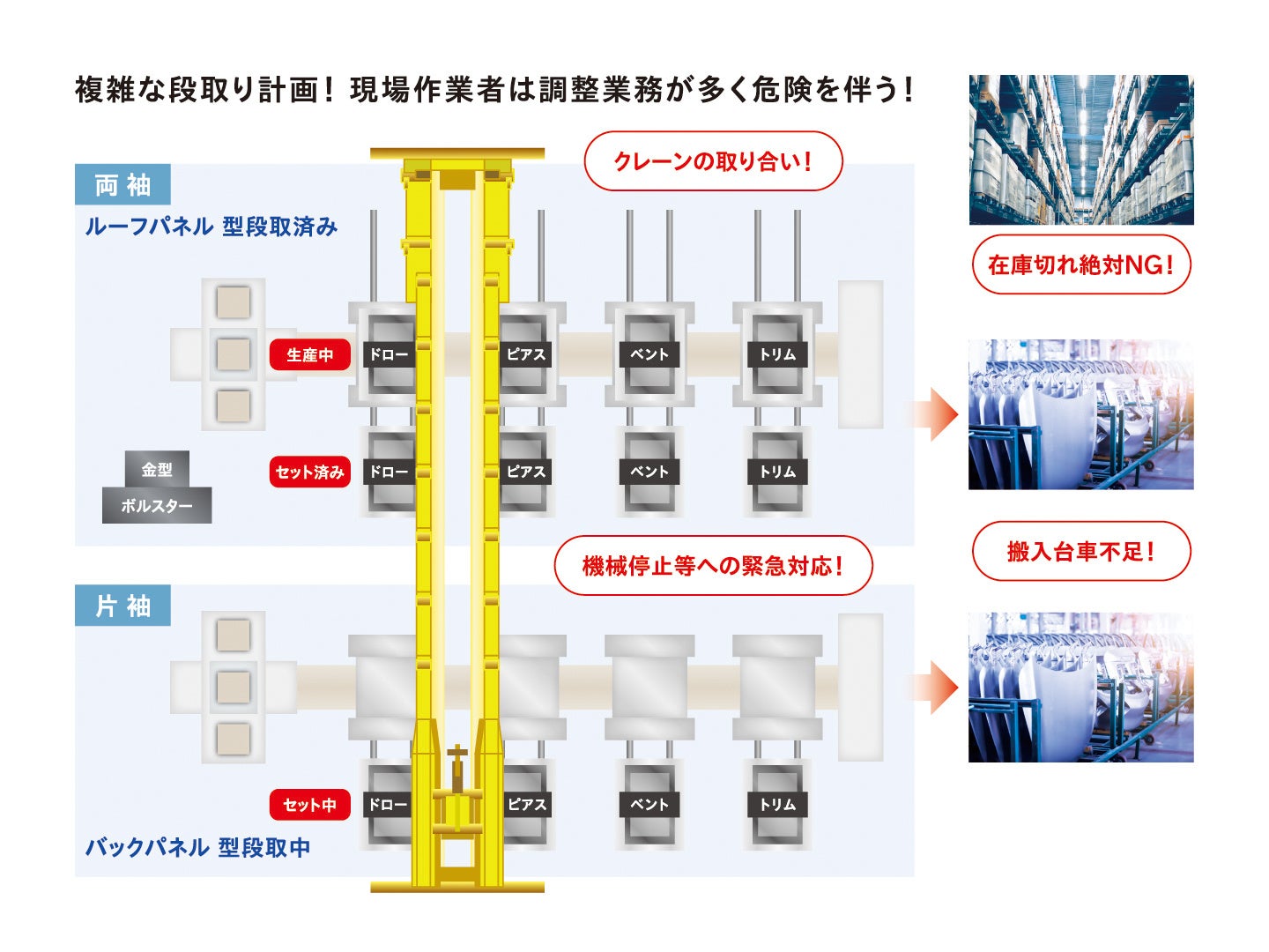 タンデムプレス、トランスファープレスの生産ラインは、設備自体は自動ですが、その周りの段取業務は、様々な調整業務をクレーン担当、ブランクライン担当、部品搬送担当等個々の担当者が人手で行っています。