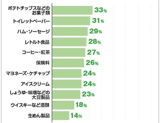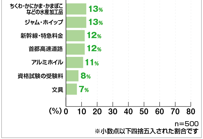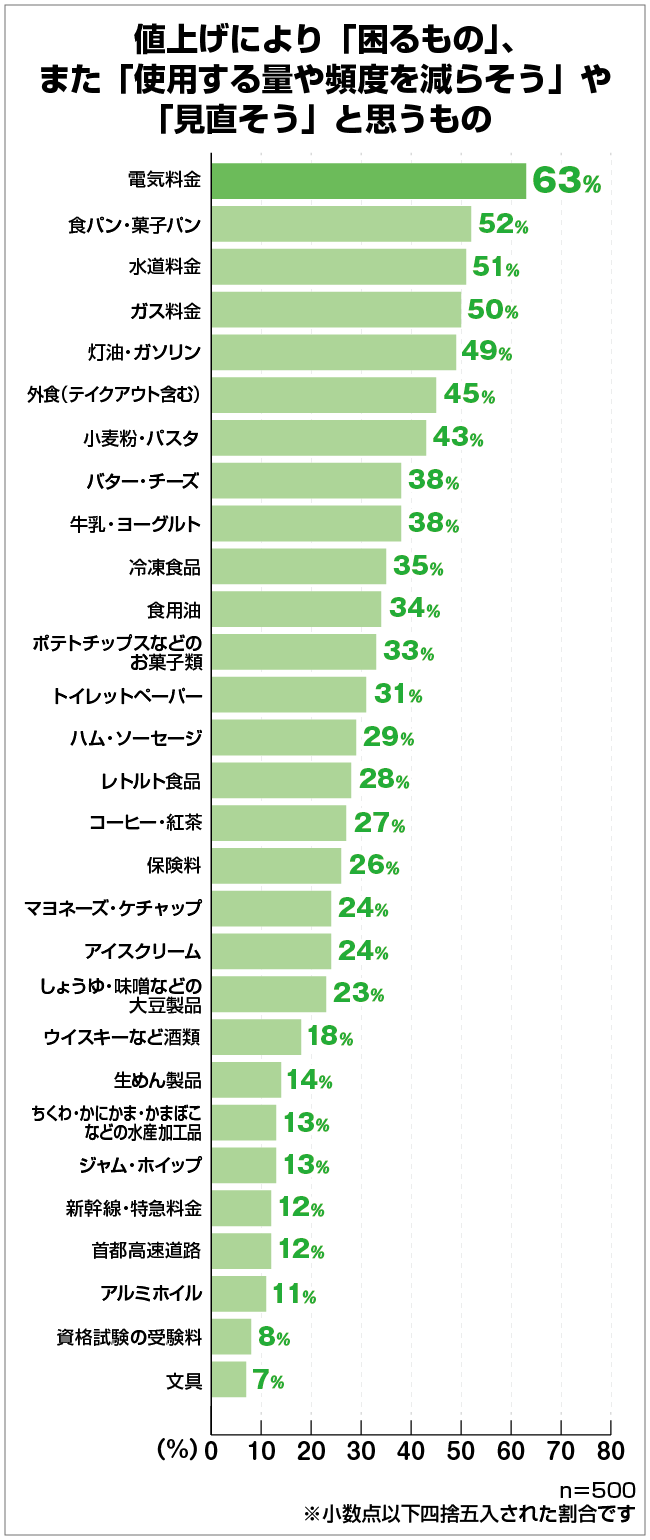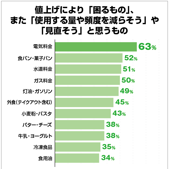 では何を買い控えるか、「値上げにより困るもの、使用する量を減らそう・見直そうと思うもの」では、以下の品目が上位に挙げられました。