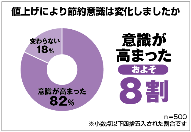 「値上げによって節約意識が変化したか」という問いに対して、82%の人が「意識が高まった」と答えています。