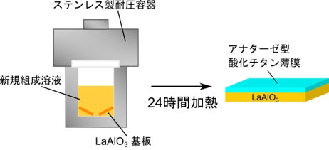水、エタノール、アセチルアセトンをベースとする溶媒に、チタン源となる試薬と成長制御を目的としてフッ素化合物を加えた酸の使用量を抑えた溶液を調整しました。この溶液を用いてソルボサーマル法によるアナターゼ型酸化チタンのエピタキシャル薄膜の簡便な新規作製法を確立しました。また課題であった薄膜成長とアルミン酸ランタン単結晶基板溶解の抑制を両立しています。