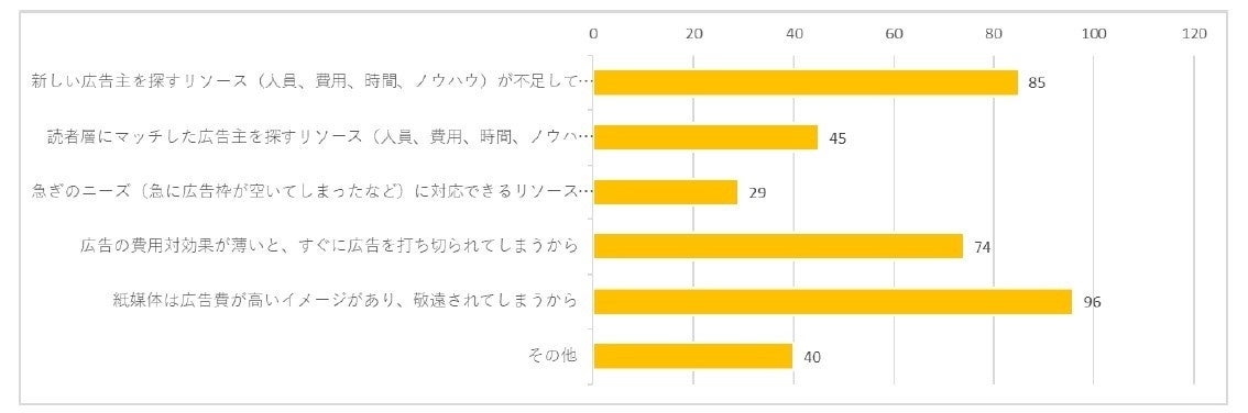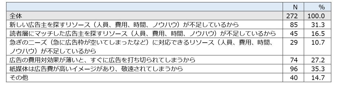 Q.7で、「広告スペースを増やす」「広告料金を上げる」のいずれも選択しなかった272名に、選択しなかった理由を聞いたところ、最も回答が多かったのは「紙媒体は広告費が高いイメージがあり、敬遠されてしまうから」で96名(35.3%)(複数回答)だった。
