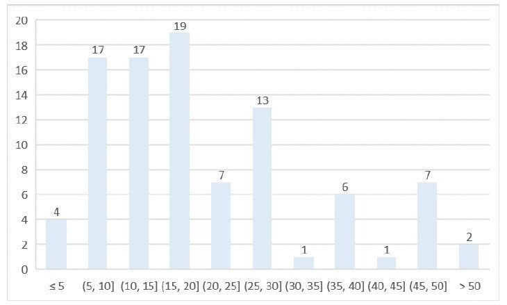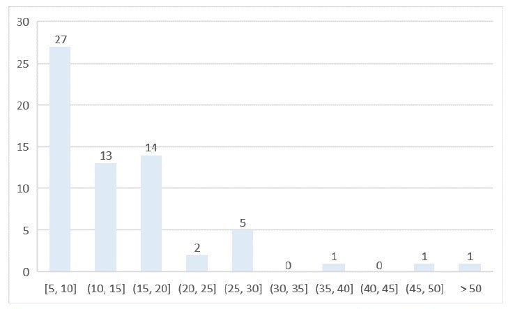 Q.3で、2023年内に、紙の値上げ予定が「あると聞いている」と答えた回答者144名に値上がりの割合を聞いたところ64名から回答が得られ、回答者の平均の値上がり率は17.8%となった。分布を見ると5%~10%値上がりすると答えた回答者が27名と最も多くなった。
