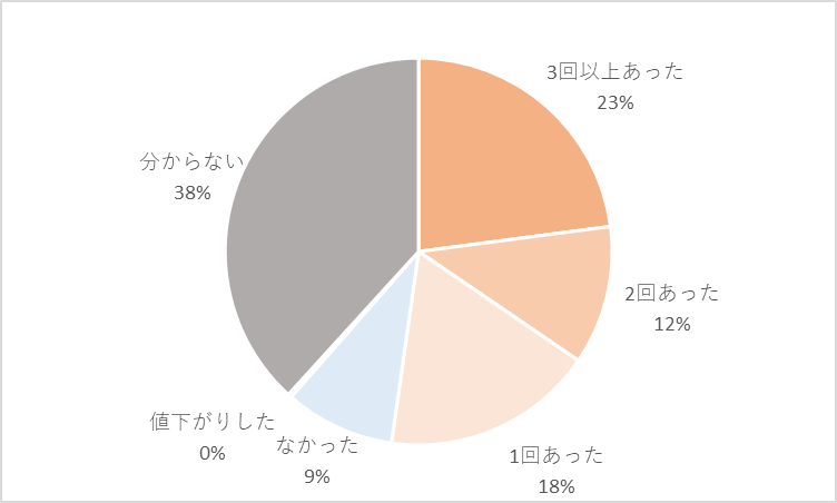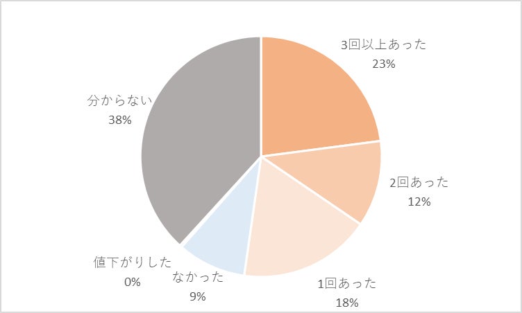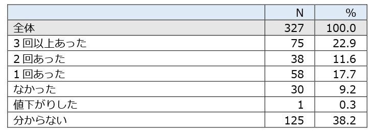 最も回答が多かったのは「3回以上あった」で22.9%だった。この一年で1回以上、紙の値上げが「あった」と答えた割合は、全体の52.2%となり半数以上になった。