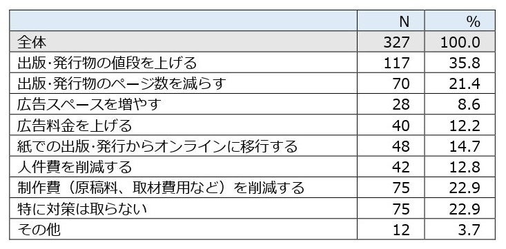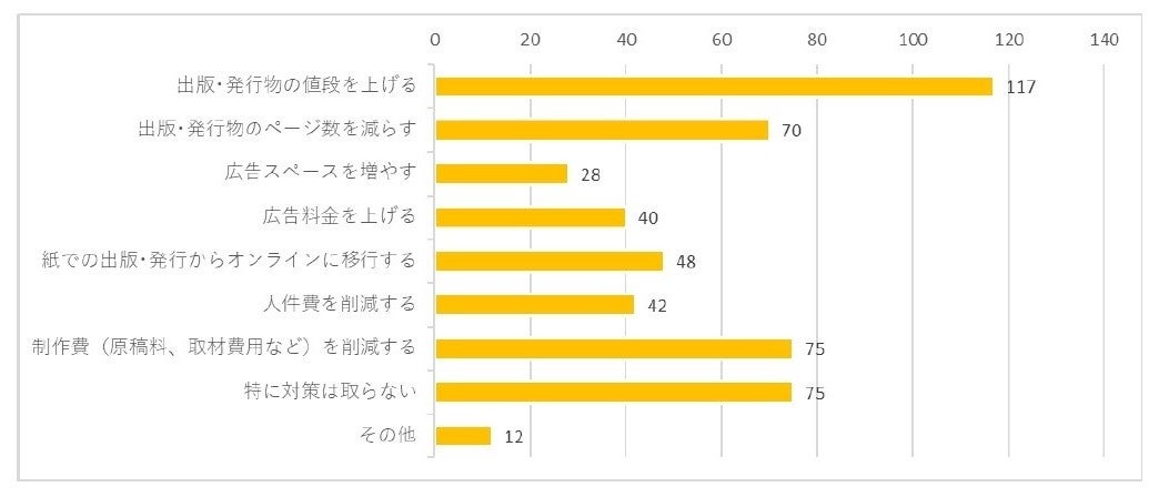 最も回答が多かったのは「出版・発行物の値段を上げる」で117名(35.8%)(複数回答)だった。