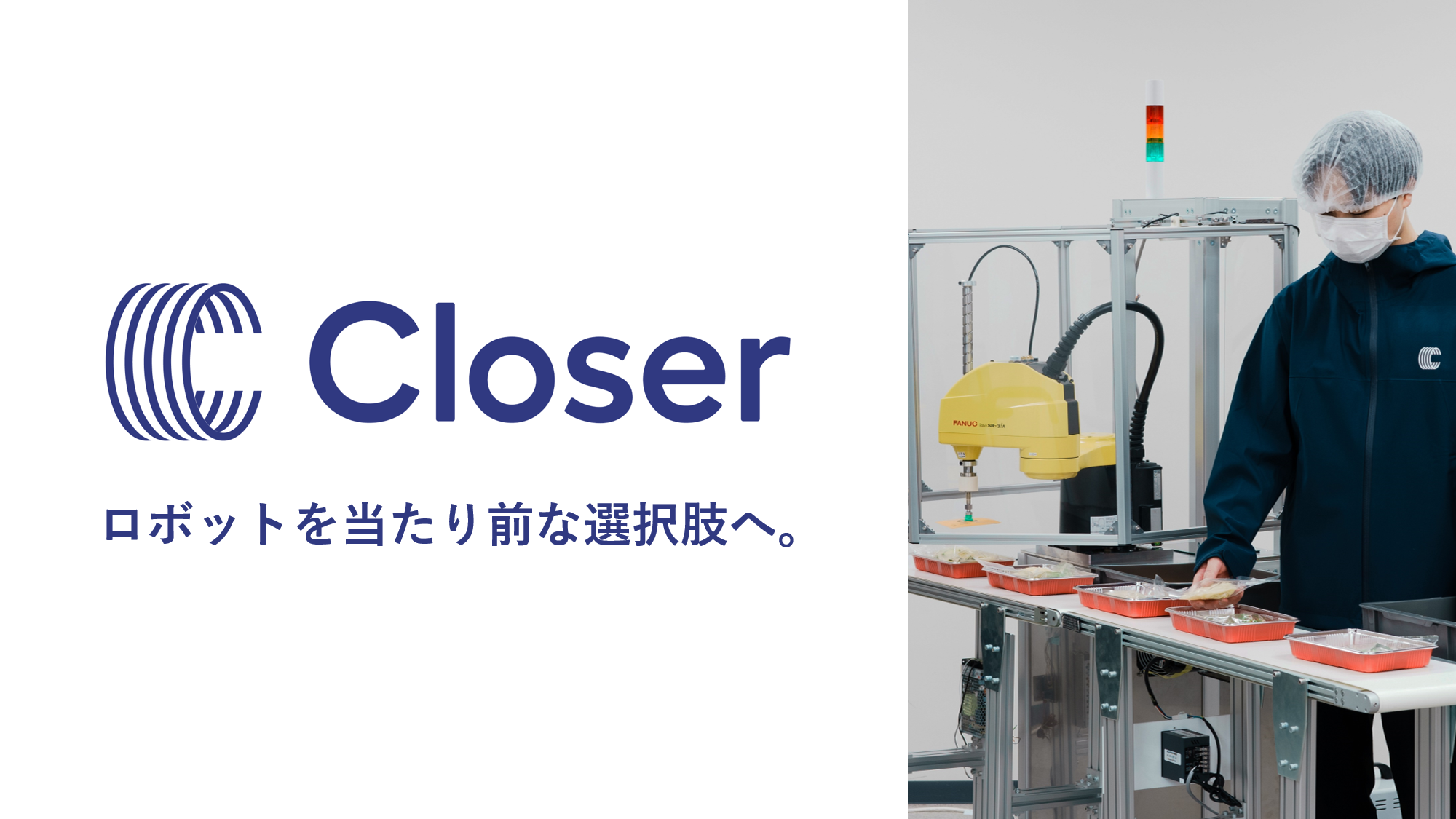 Closerでは、食品、化粧品、医薬品(三品)産業を中心とした製造現場が直面する、人手不足や生産能力の課題をAI画像処理、ロボット制御技術で解決することを目指し、設立されたAIロボットベンチャーです。今年3月にシードラウンドで1億円の資金調達を行い、4月には日本を代表するスタートアップとして経産省のJ-Startupに1万社から選出されました。