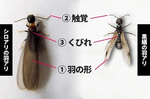 A. 見た目が似ているため、一般の方がその場で正確に見分けるのは簡単ではありません。見た目だけで判断せず、発生時期、発生場所、羽アリの数、床下や木部の状態も含めて確認することが大切です。