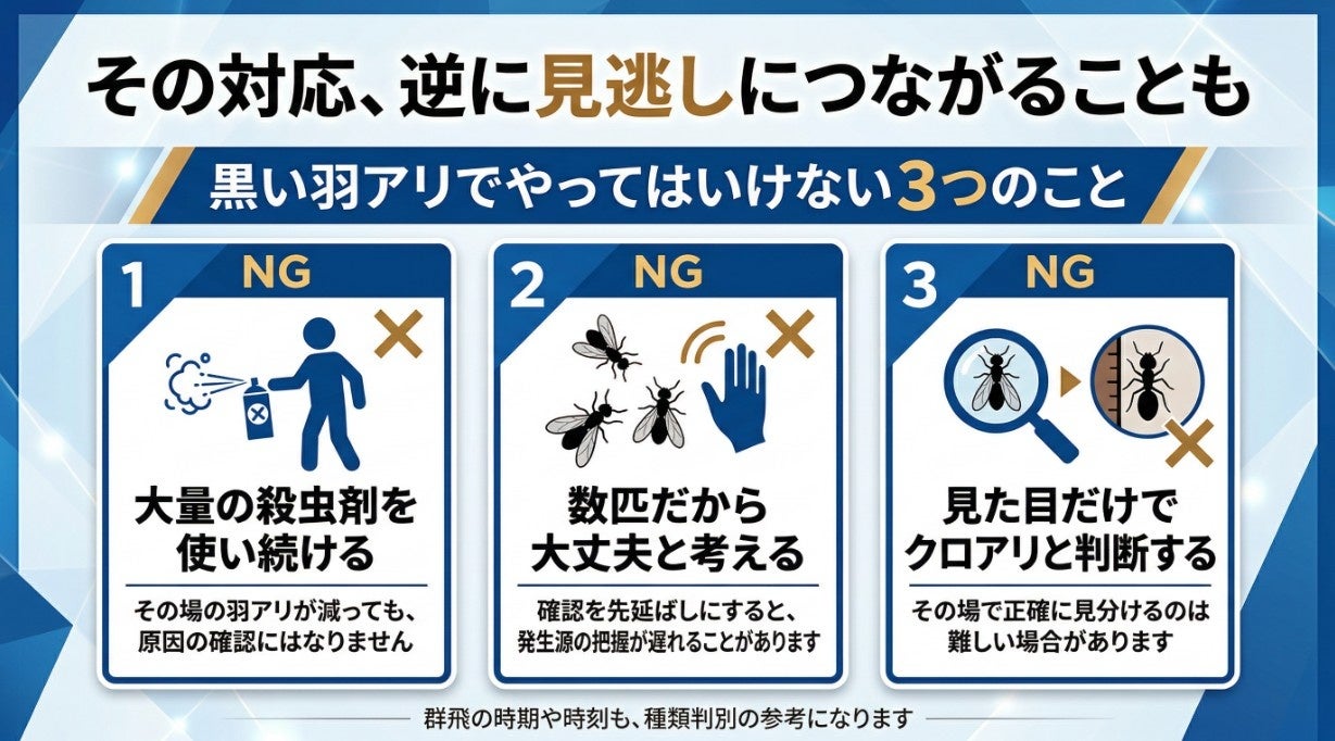 ・再発防止のためには、羽アリの処理だけで終わらせず、床下調査と発生源確認が重要