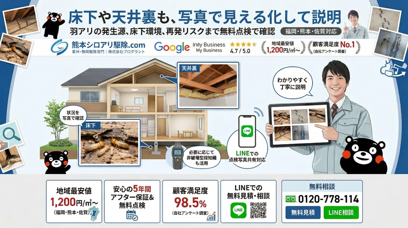 プログラントでは、福岡県・熊本県・佐賀県を対象に、シロアリ被害の有無だけでなく、羽アリの発生源、床下環境、再発リスクまで含めた無料点検を行っています。家の中で黒い羽アリを見た方に対しても、その場の駆除だけで終わらせず、「本当に床下でシロアリが活動していないか」「放置しても大丈夫な状態か」まで確認することを重視しています。