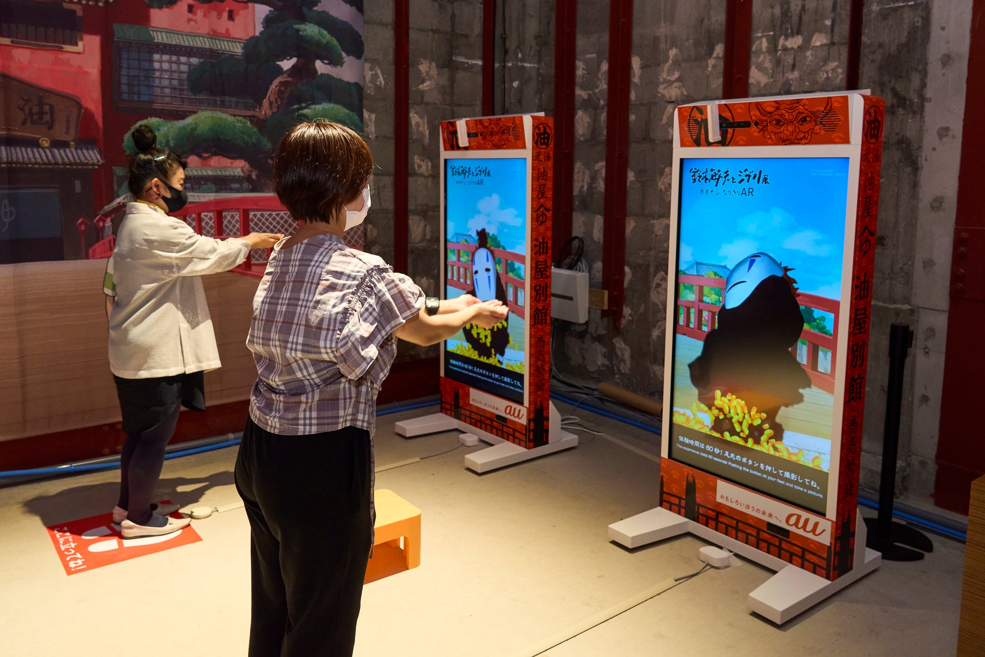 油屋別館に設置されたサイネージの前に立つと、画面上に「千と千尋の神隠し」のカオナシになった自分の姿が現れます。会場で配布されるQRコードをスマートフォンで読み込むと撮影した写真を保存できます。