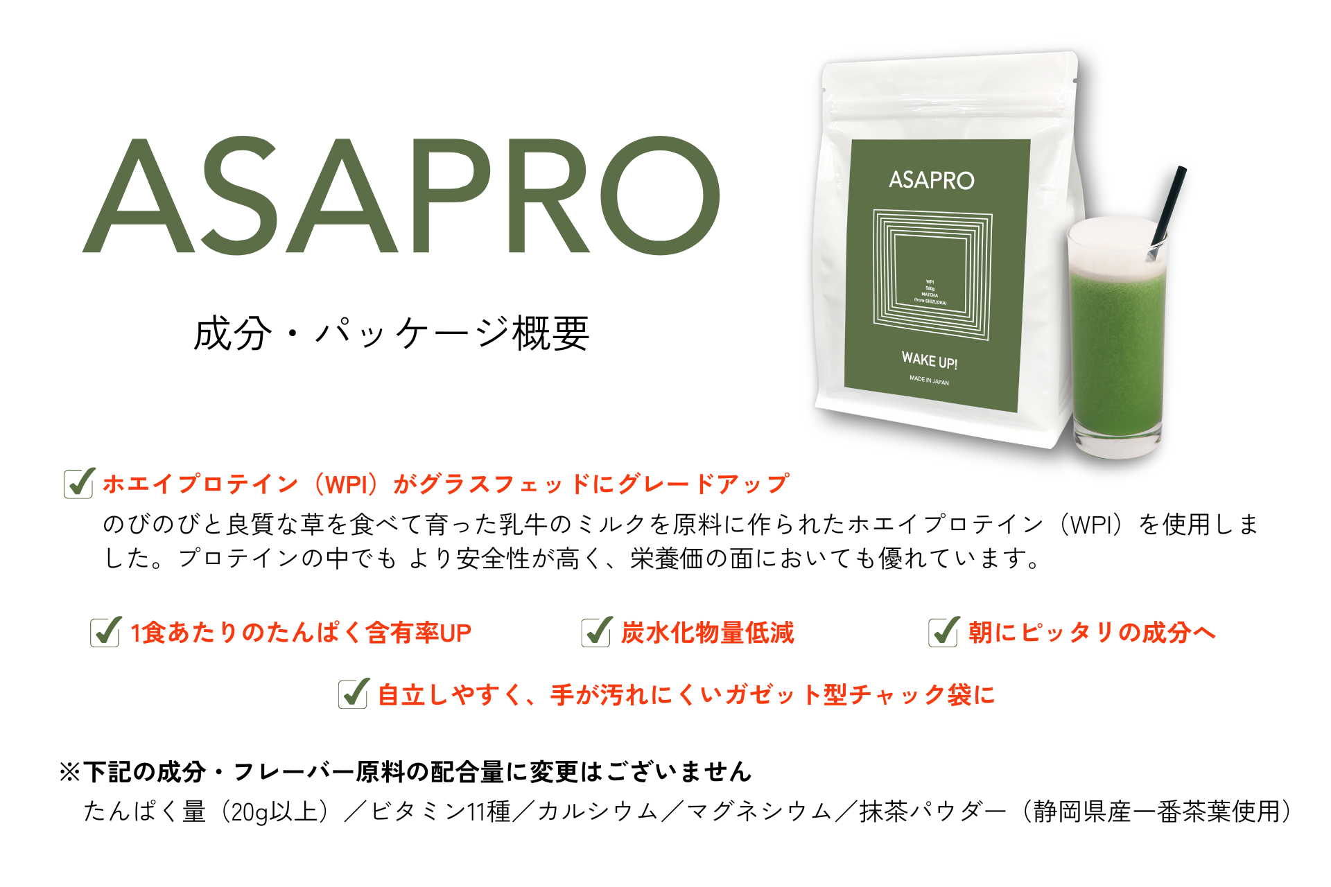 静岡県産抹茶による香り高いフレーバーはそのままに、配合・パッケージ・価格を見直し、2023年9月1日(金)より『ASAPRO(アサプロ)』として発売します。