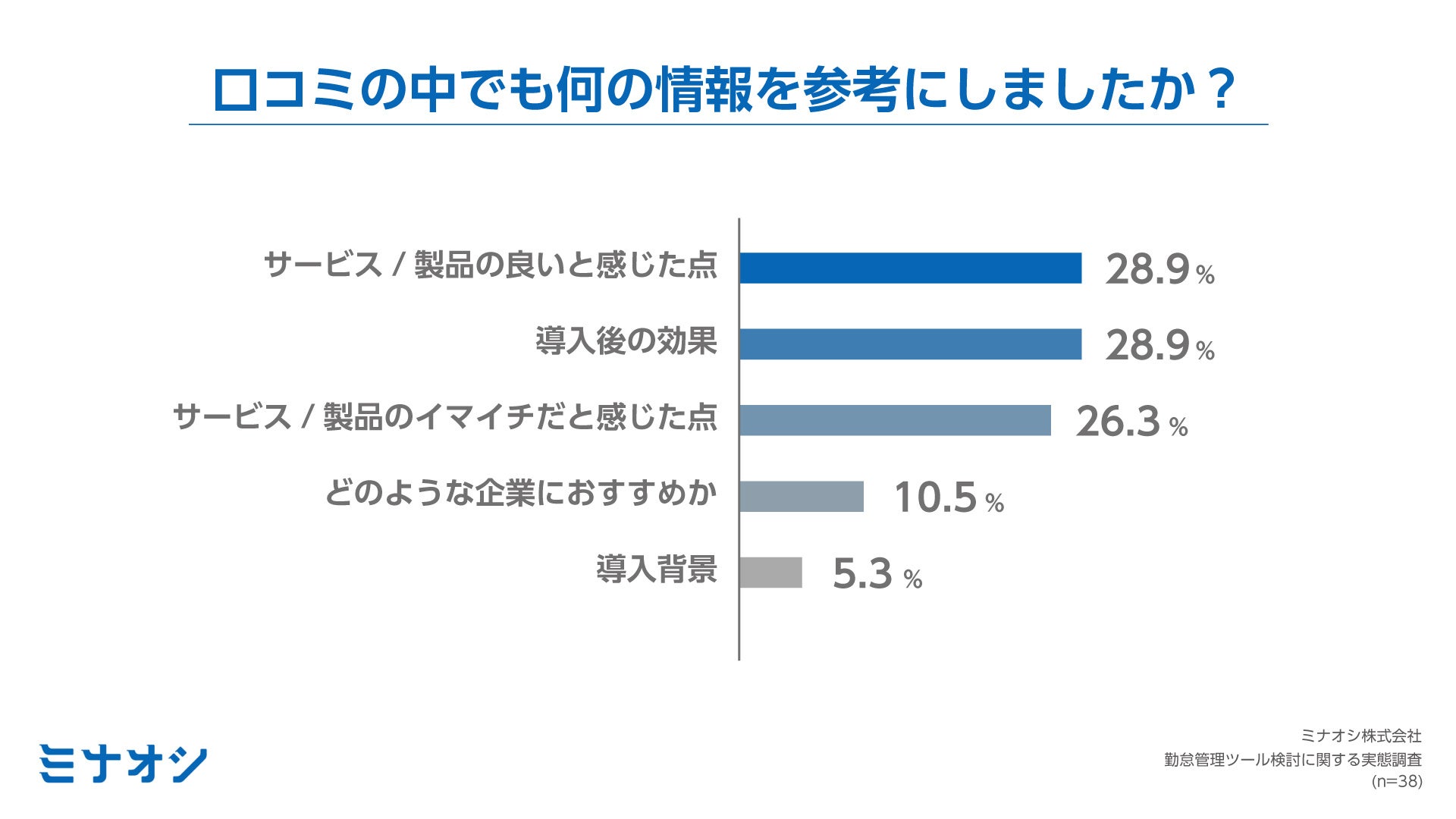 「サービス/製品の良いと感じた点」「導入後の効果」が同率で28.9%、「サービス/製品のイマイチだと感じた点」が26.3%、「どのような企業におすすめか」が10.5%という回答となりました。