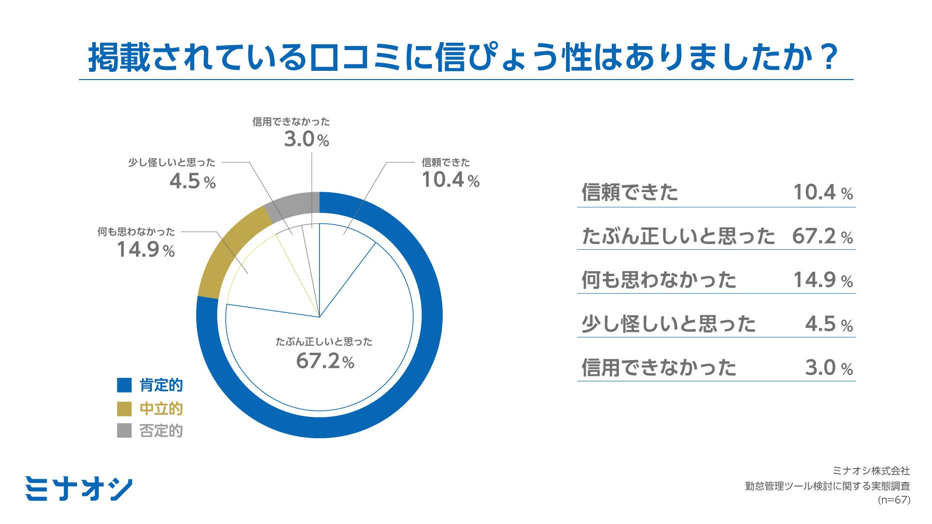 BtoBツール評価プラットフォーム「ミナオシ」を運営する株式会社ミナオシ(所在地:東京都目黒区、代表取締役:寺倉大史)は、企業のバックオフィス管理部門67名を対象に、勤怠管理システムをはじめとする業務支援システム導入時の口コミの影響や参考とする口コミの共通点について調査しましたので、その結果をお知らせします。