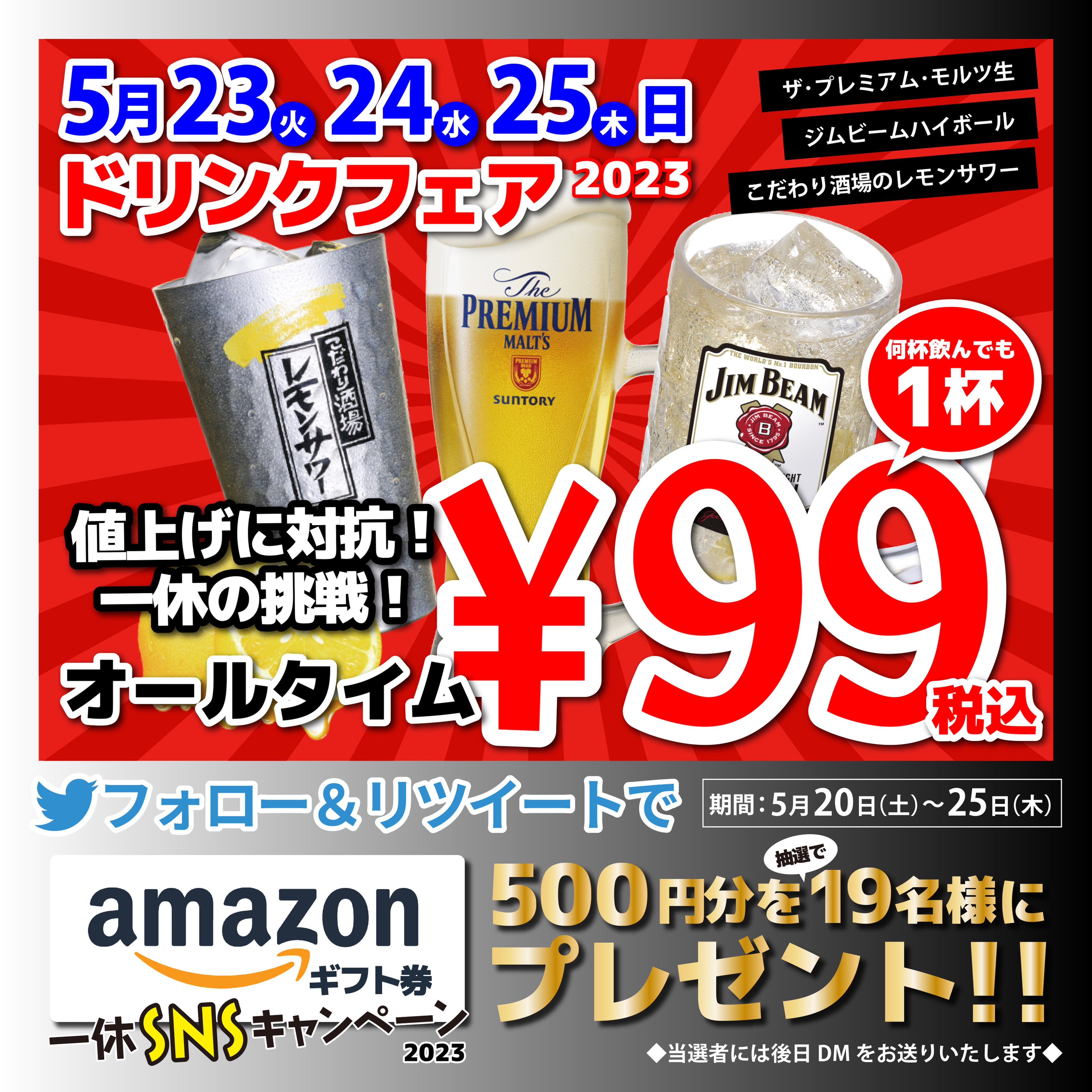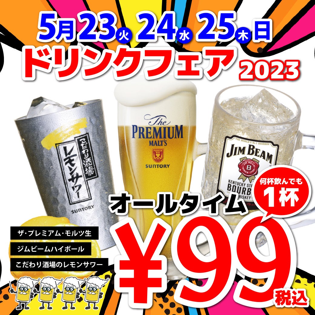 プレミアムモルツ税込99円!5月23~25日に居酒屋一休ドリンクフェア開催!!こだわり酒場のレモンサワー、ジムビームハイボールも税込99円!