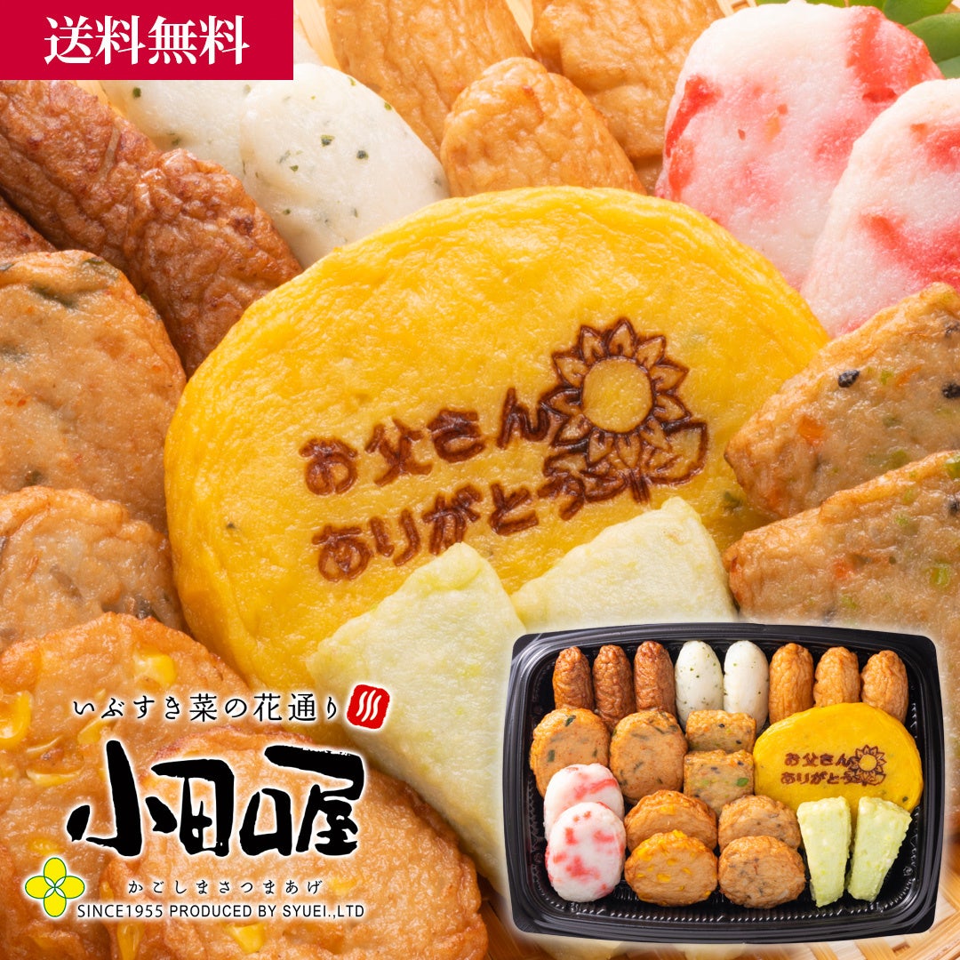 薩摩半島の南端に位置する鹿児島県指宿で創業60年余り歴史がある『小田口屋』が作る創作さつま揚げの父の日特別セットです。『お父さんありがとう』を焼印したさつま揚げやお父さんの健康を想った野菜や海鮮具材をネタに取り入れたバラエティ豊かなさつま揚げを詰合せにしました。