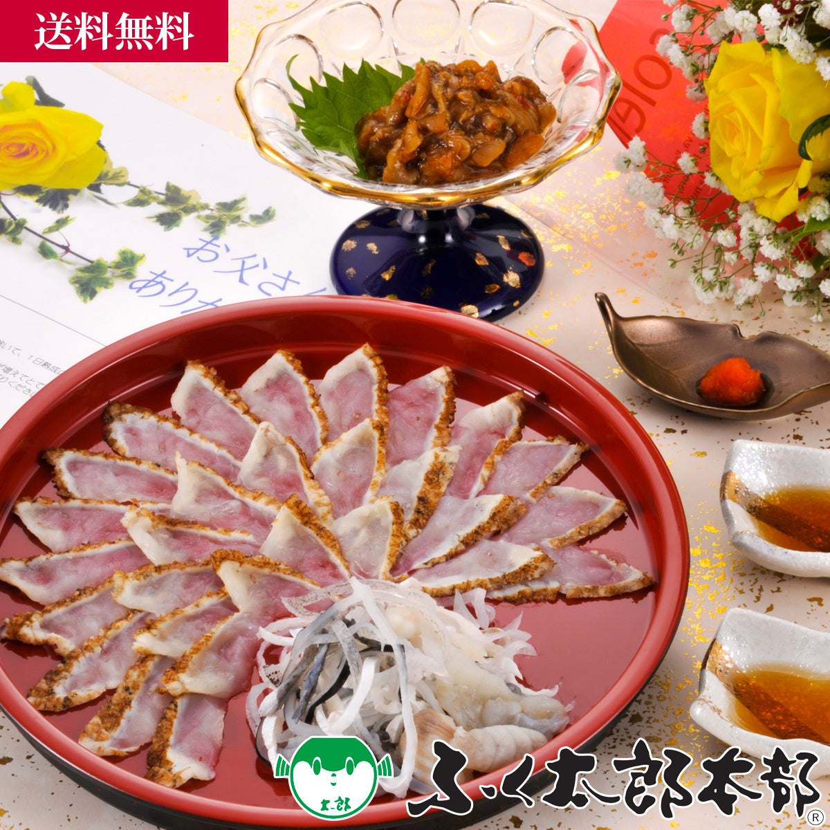専門の職人が引いた、炙り刺身は外側は香ばしく、内側は透明感があり生の食感が楽しめます。とらふぐの身を豆板醤などで漬け込んだ珍味とセットになっています。「お父さんありがとう」のメッセージ(しおり)を同封してお届けします。