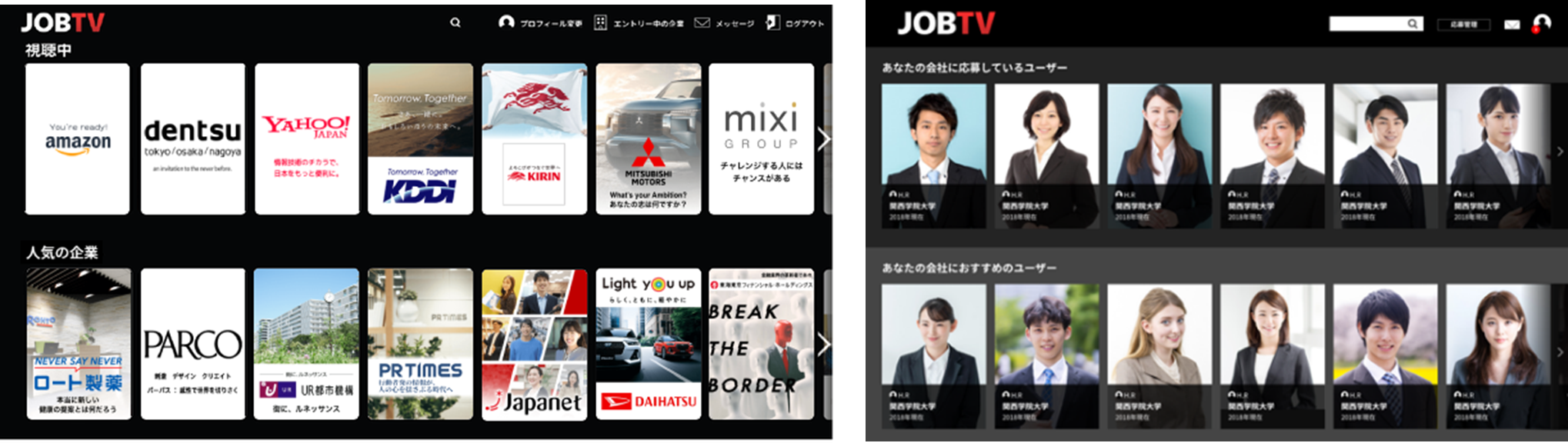 JOB TVは、就職/採用活動における、「(自身/自社の)魅力を伝えづらい」「(就職/採用活動に)時間がかかる」といった就活生側・企業側双方の課題を解決する、これまでにない動画コンテンツを中心とした採用プラットフォームサービスです。企業・就活生は動画を通じ、魅力を分かりやすく伝えることで、スピーディーなマッチングを実現します。 JOBTVサービスサイト:https://jobtv.jp
