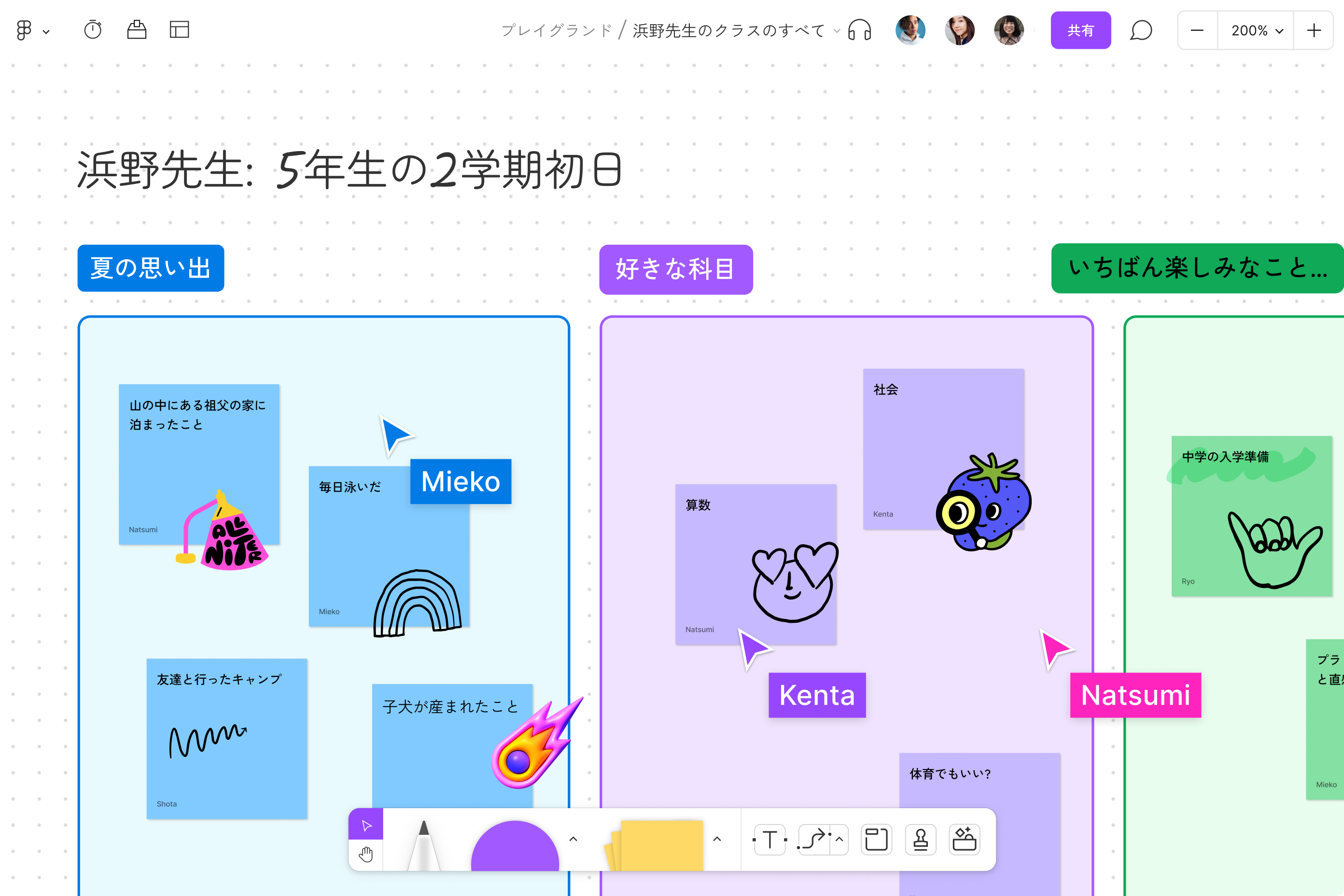 Figma を活用し、子どもたちは身の回りから得た気づきやヒントを整理したり、共有することがより一層簡単になりました。また、児童同士でお互いにインスピレーションを得ることで試行錯誤しながら、考え方やコンセプトを創造することができます。Figma は新しいアイデアや価値を生み出すのにとても適したツールだと思っています。一方、私たちの学校の教師は Figma を使うことで、児童からの意見や学習成果をこれまでよりも集めやすくなりました。さらに、対話を深めたり広げたりすることで児童の思考を把握しながら、授業に幅や深みを持たせることが可能になったと感じています。