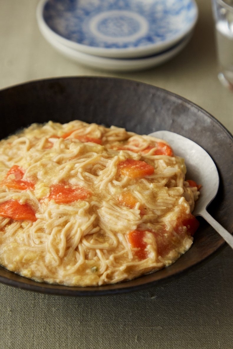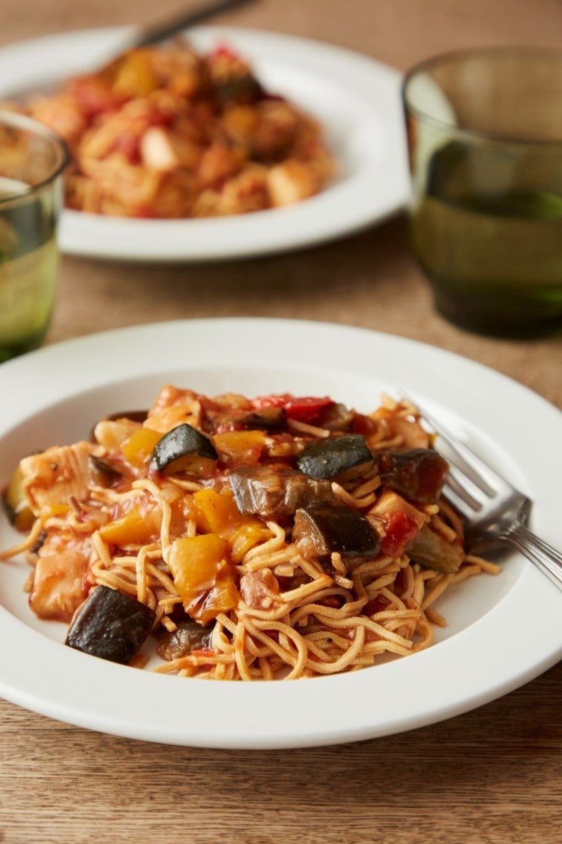 トマトパスタ風の一品です。優食の豆腐干は表面に凹凸加工が施されているため、ソースとよく絡むこともポイントです。