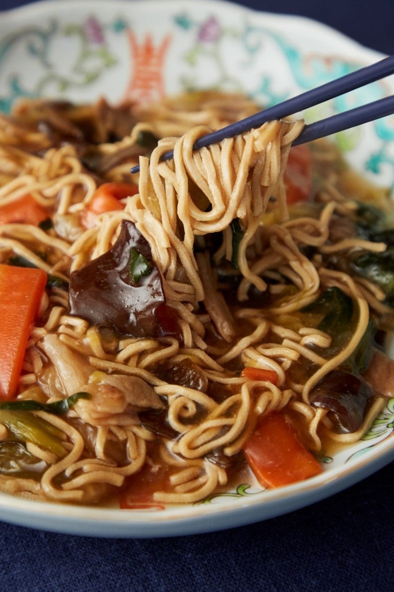 中華圏の伝統食材である豆腐干を、相性ぴったりの中華あんかけで絡め、食べ応えも十分のあんかけ焼きそば風に仕上げました。豆腐干に馴染みがない方でも食べやすい、醬油ベースで味付けしています。