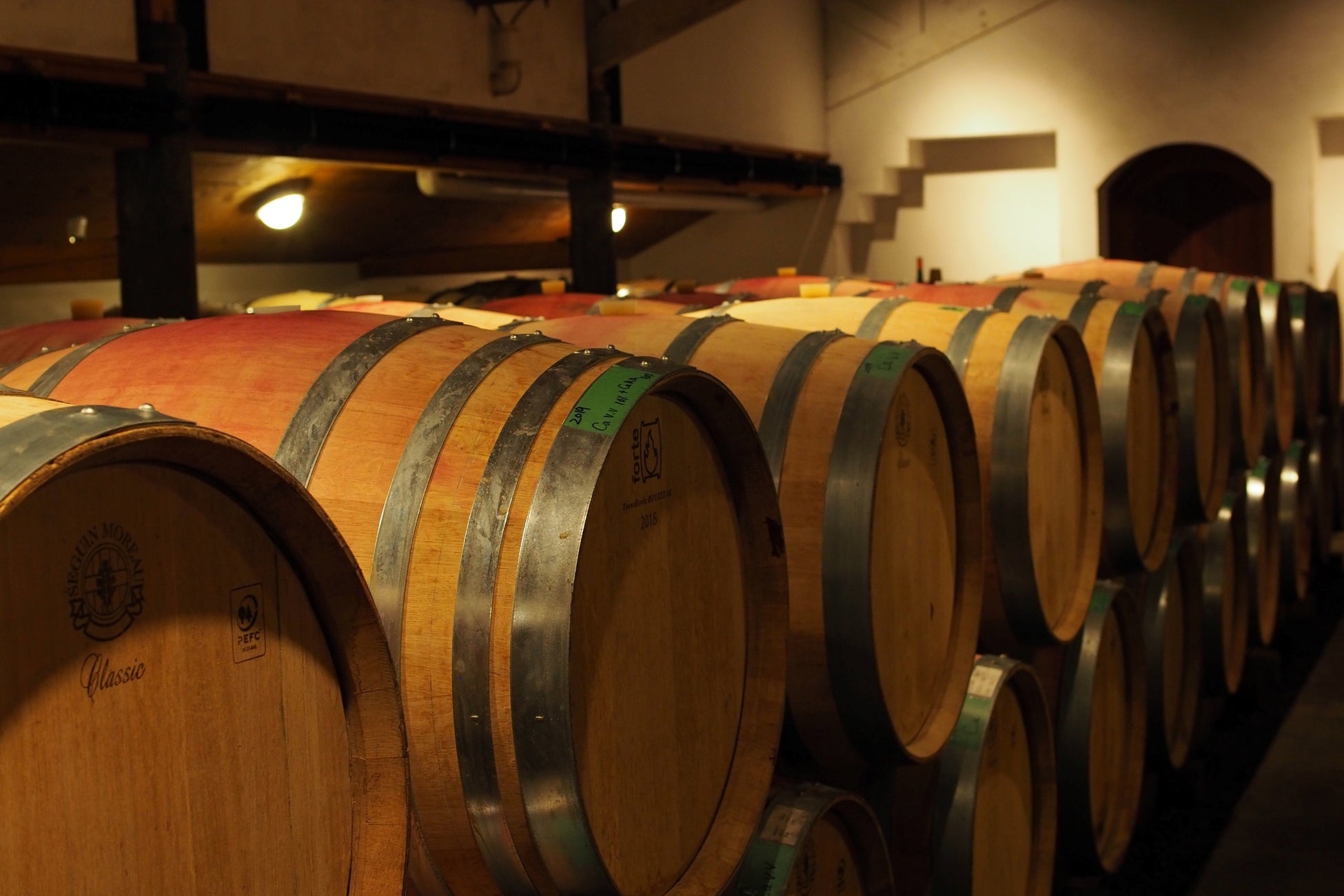 秋に収穫を終えたぶどうは仕込みを経て、オーク樽の中で静かに熟成をしています。ご案内する樽庫では、豊かな香りに包まれ、そしてひんやりとした空気を感じることができます。綺麗に並ぶ樽や、造り手が書き込んだ文字などから、ぜひワイン造りの現場を体感してください。