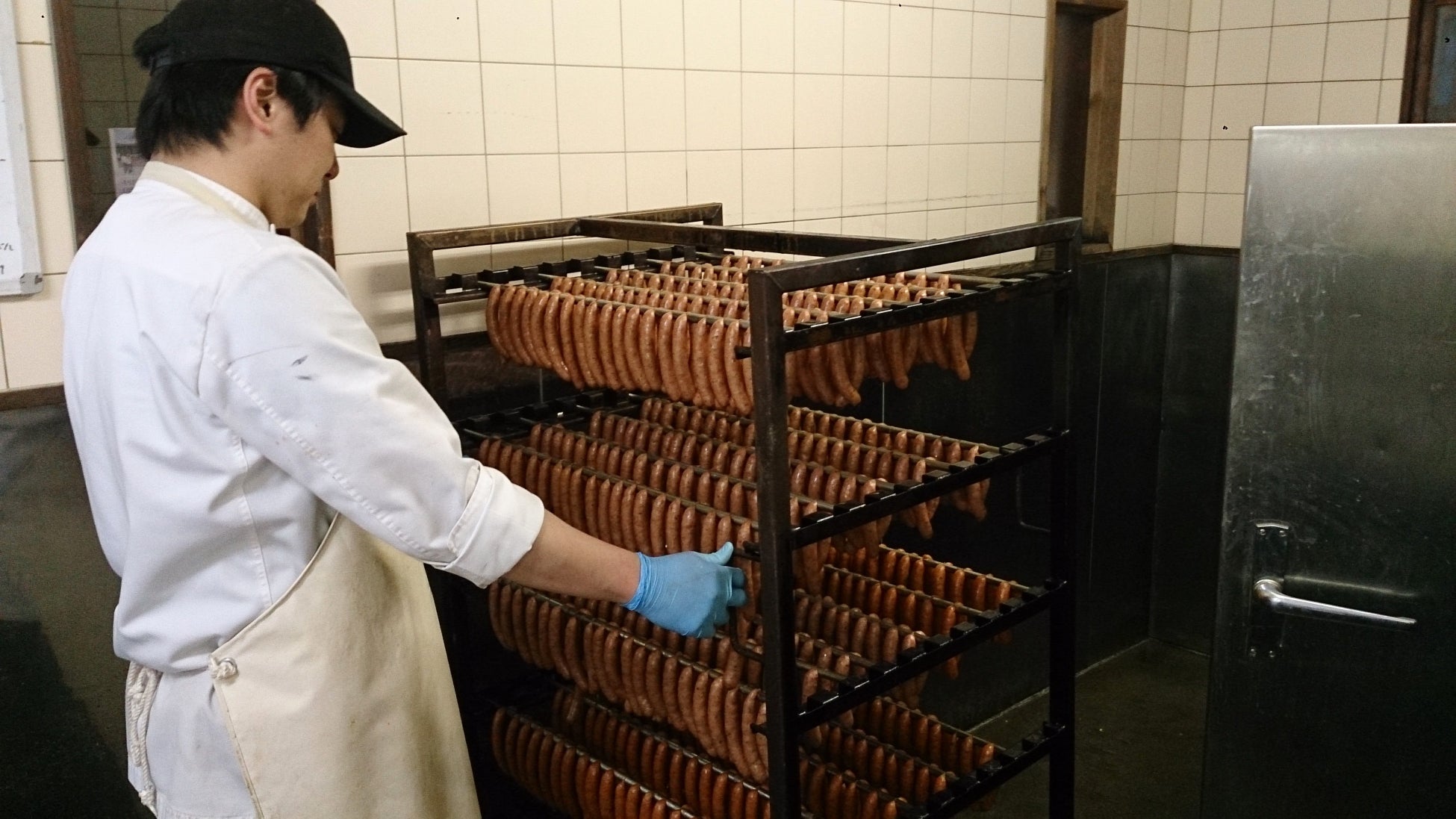 同じくレストラン薪小屋内では、越後もち豚100%のハム、ソーセージ、ベーコンを造っています。原料の良さをシンプルに表現するため、ドイツ製法にこだわり添加物は極力抑えています。この機会にしか味わえない、燻製器から出したばかりのソーセージの試食をお楽しみください。
