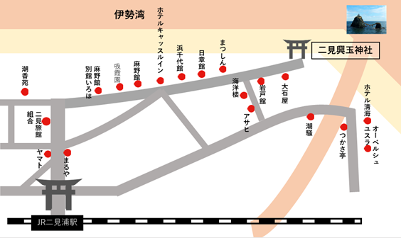 二見町旅館街は、全国にも知られる「夫婦岩(めおといわ)」のそびえる二見浦海岸を中心に広がる旅館街です。古来より、伊勢神宮への巡礼の旅、すなわち“お伊勢参り”は、二見の浜辺で海に浸かり、禊(みそぎ)をしてから神宮に参拝するのが習わしであり、この旅館街は参拝客にとって重要な旅の拠点でした。
