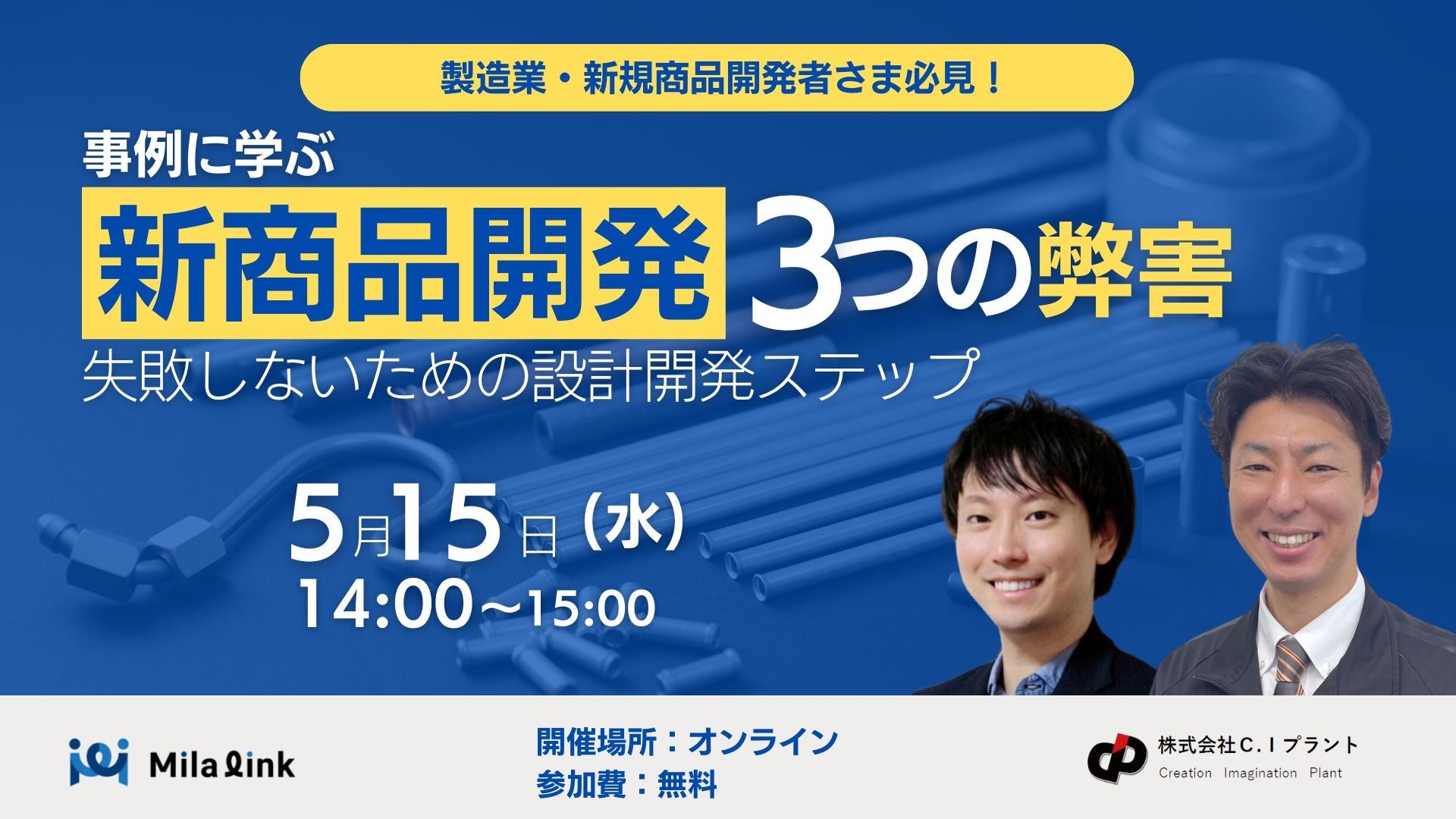【5/15(水)オンライン開催!】メーカー新商品開発担当様必見!「事例に学ぶ『新商品開発』3つの弊害 〜失敗しないための設計開発ステップ〜 オンラインセミナー」のお知らせ