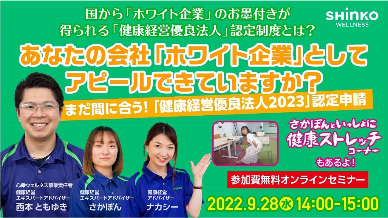 企業内売店・食堂運営をメインに、福利厚生支援サービスを展開する心幸グループの「健康経営」に特化した事業会社である心幸ウェルネス株式会社(本社:兵庫県尼崎市、代表取締役:山﨑 忠 以下、心幸ウェルネス)は、2022年9月28日(水)に「健康経営優良法人」認定制度で企業のイメージアップする方法セミナー」と題する無料セミナーを開催いたします。( 申し込み先:http://www.shinko-jp.com/business/shinko-wellness/seminar-list/202209-28/)