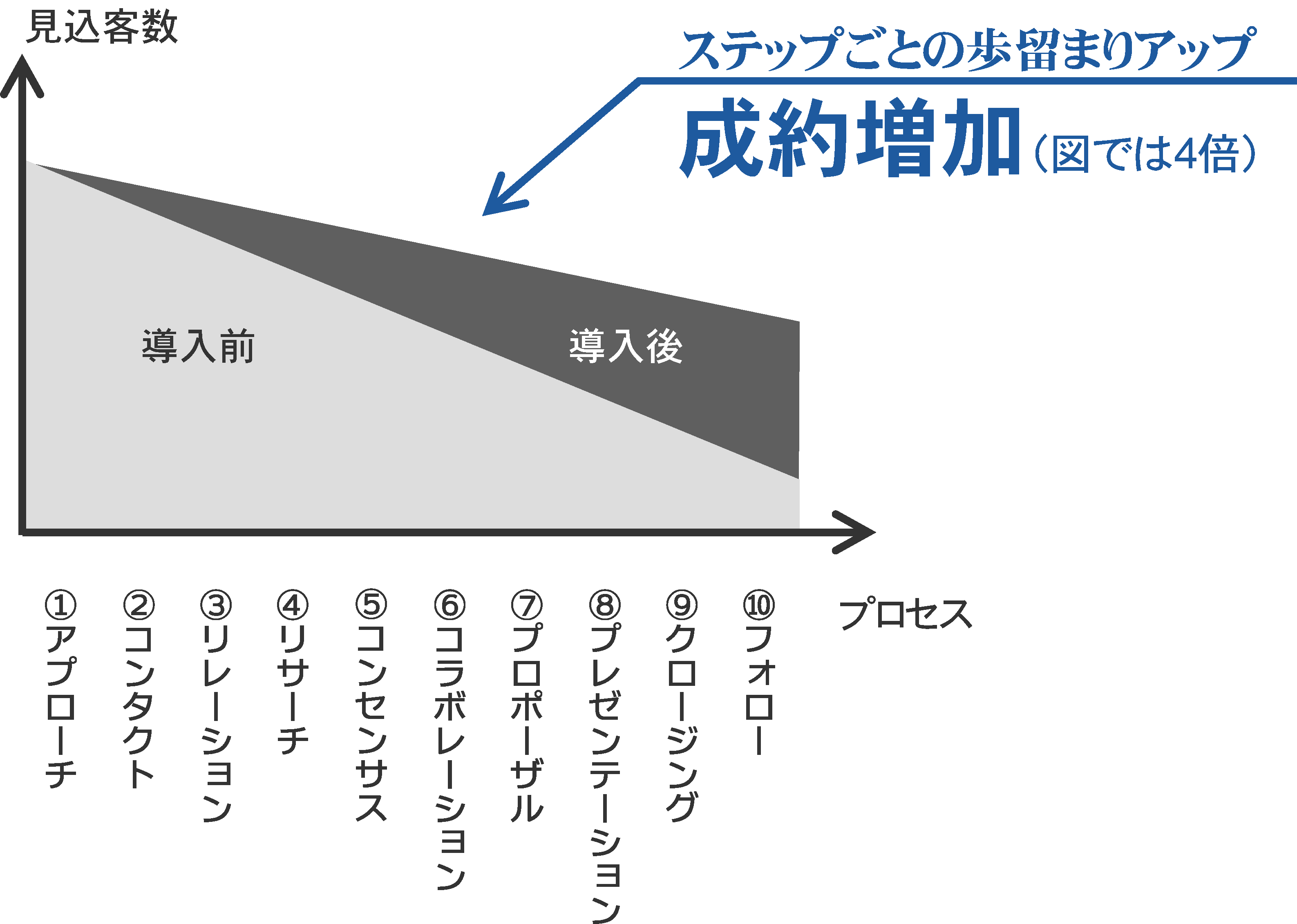 商談カンペは、収益伸長の「コアステップ」、商談成立の「ボトルネック」にフォーカスして重点的にサポートすることで、スタートからゴールまでステップごとの歩留まりを改善し、劇的な成約増加をもたらします。