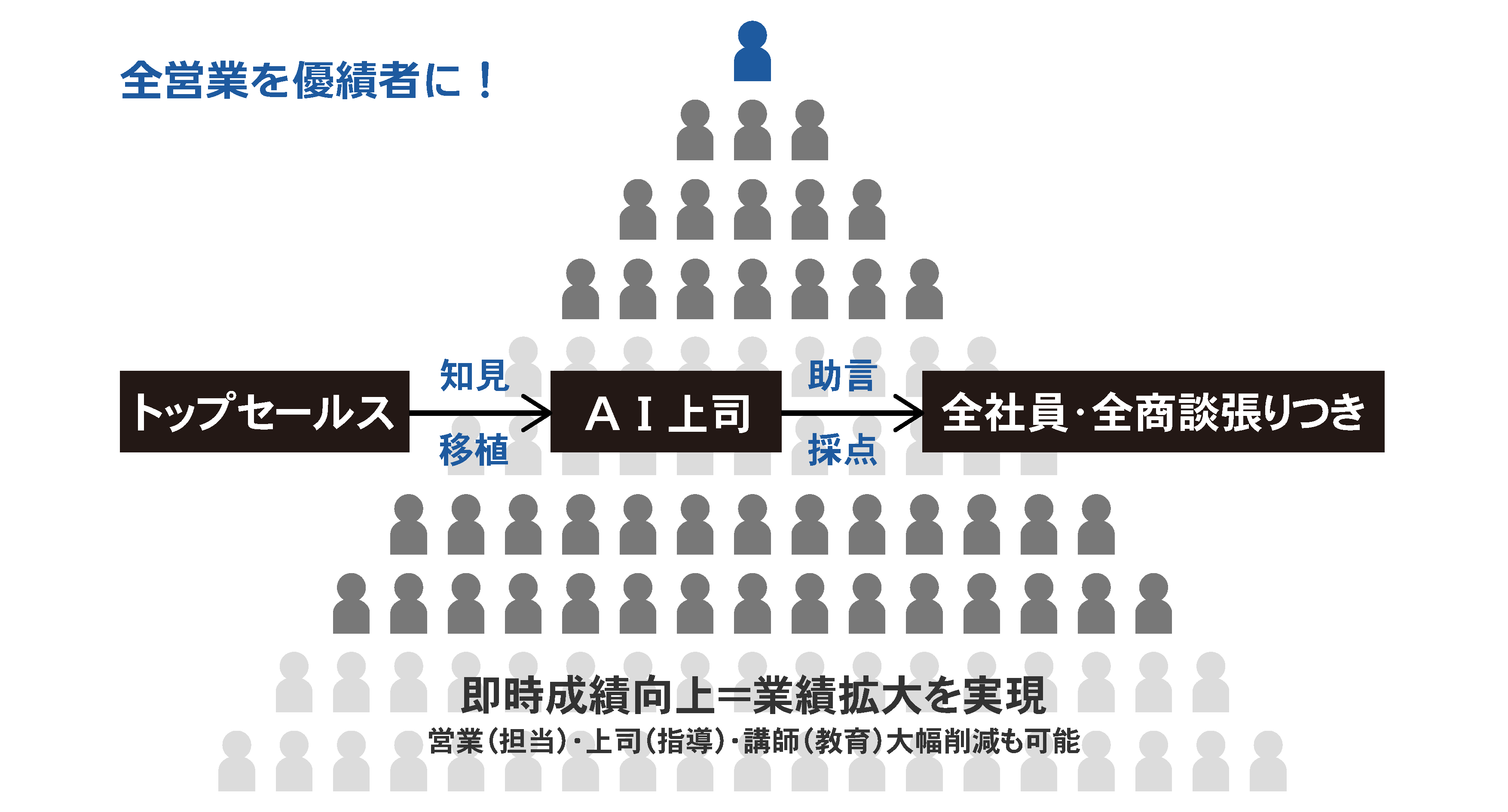 エキスパートが編纂した最高峰の知見辞書格納の「トップセールスAI」がつきっきりでサポートしてくれるイメージであり、講師の教育と上司の指導に代わって皆を優績者へ導きます。数字直結のアドバイスに絞り込んでいるので、短期間で成績不振者の底上げや営業未経験者の戦力化を果たせます。
