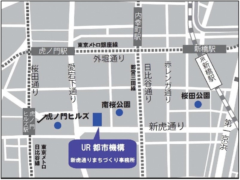 新虎小屋は、国際競争力強化に資する拠点整備が進む虎ノ門エリアと新橋駅周辺エリアの間の新橋西エリアに位置します。新橋西エリアは、港区が策定した「新橋・虎ノ門地区まちづくりガイドライン」(以下「本ガイドライン」)において、小中規模のビルを活用しながら、スタートアップ向けの働く場などを提供することで、イノベーションが生まれ続けるビジネス交流拠点を形成していくことが求められています。