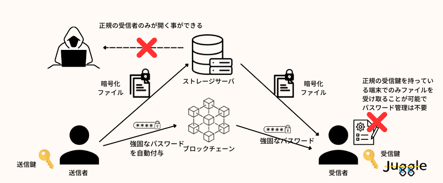 ファイルセキュリティシステム「JUGGLE」はアップロードするファイルに対し、安全性の高いパスワードを自動で生成し、ブロックチェーン技術と暗号化技術を統合し、秘匿性の高いファイル共有と快適な操作環境を実現します。