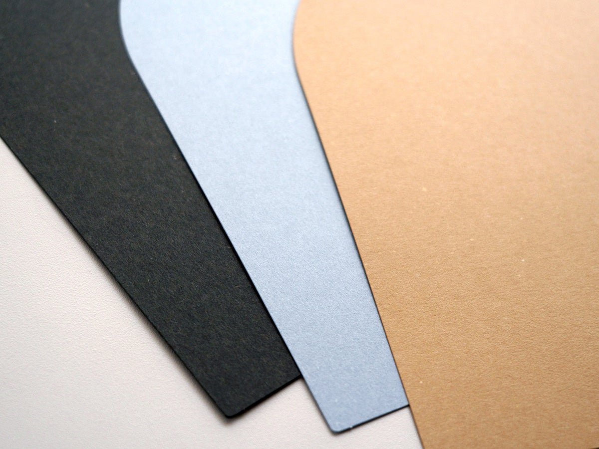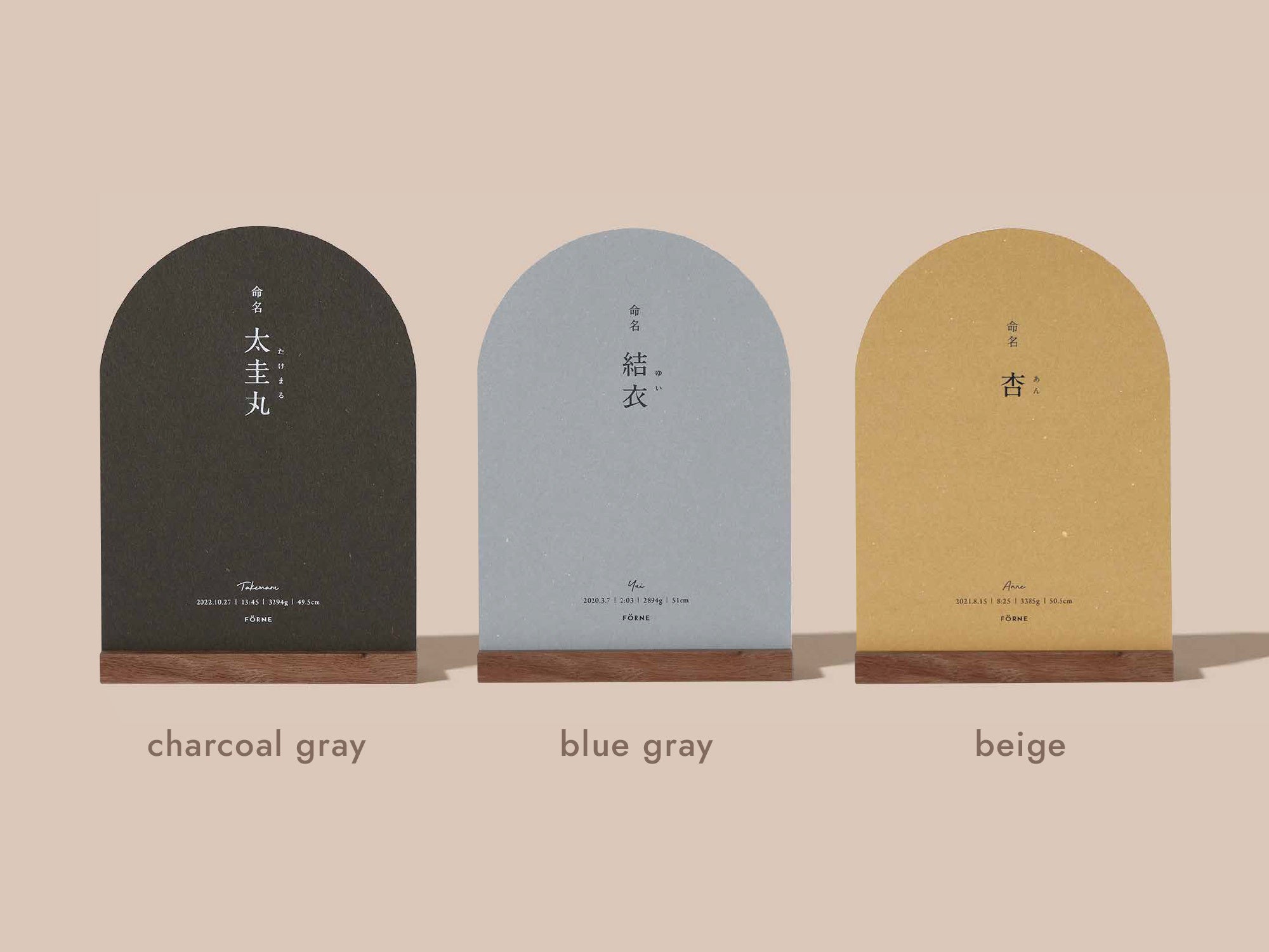 台紙と印字する文字の配色は3パターンご用意しています。ベージュ×黒文字、ブルーグレー×黒文字、チャコールグレー×白文字の3つの中からお選びください。台紙と印字色の組み合わせは変えられません。台紙は表裏ともに同じ色で、表面にのみ印字を施した状態でお届けいたします。