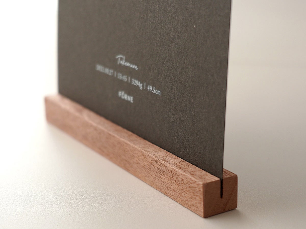 どんな場所にも飾りやすい木製スタンド付き。スタンドと台紙の幅をそろえているのですっきりきれいに収まります。