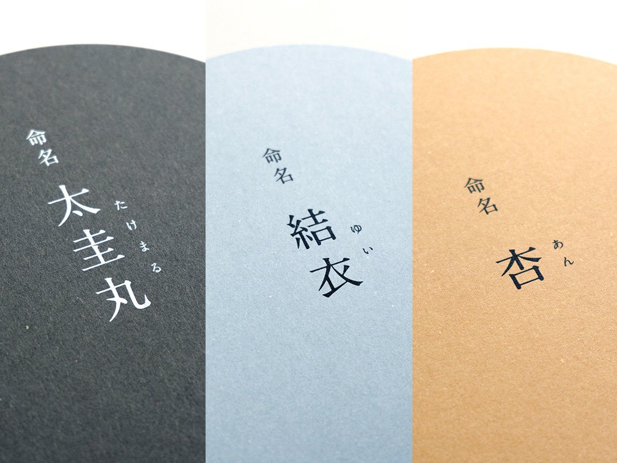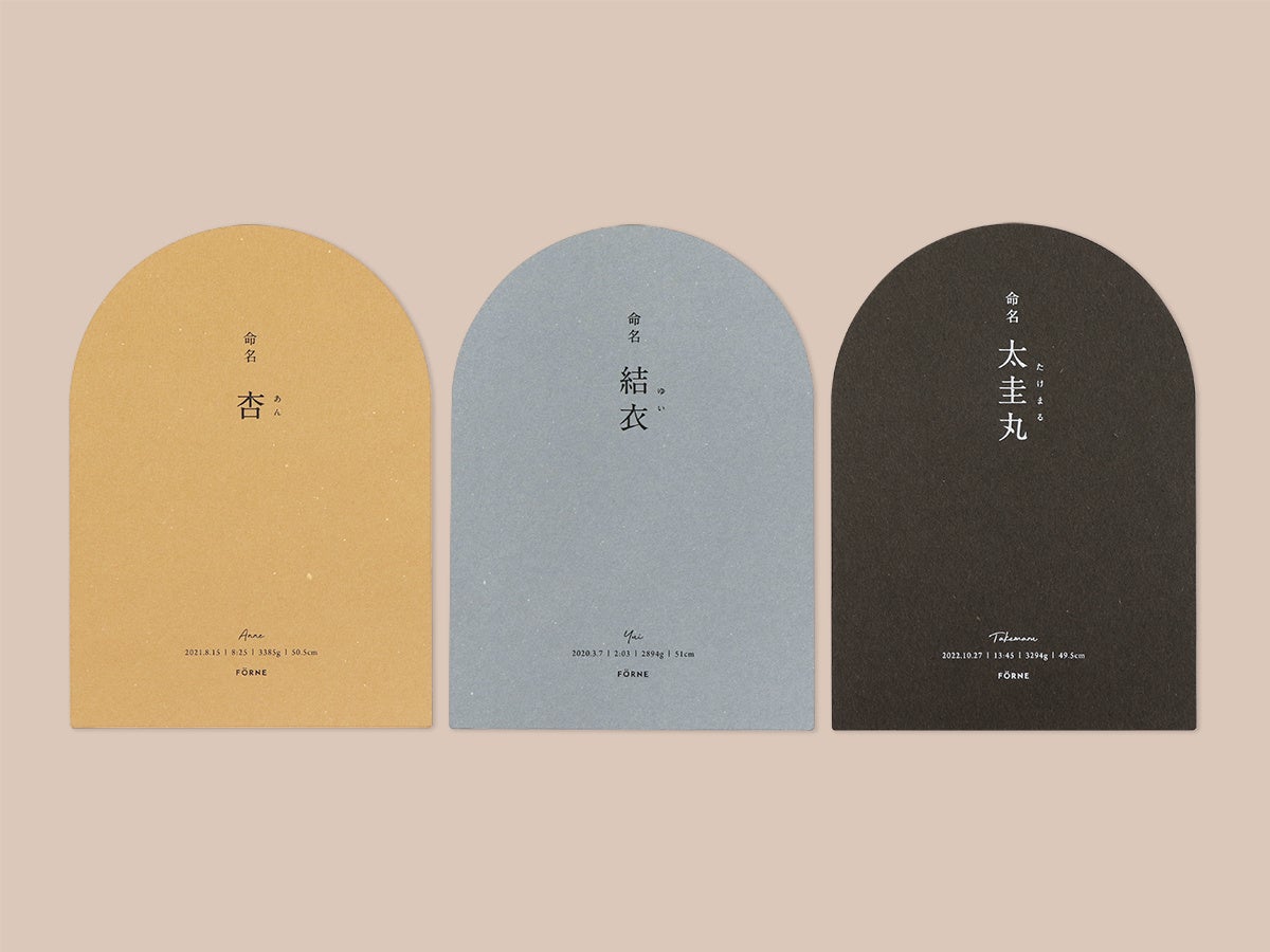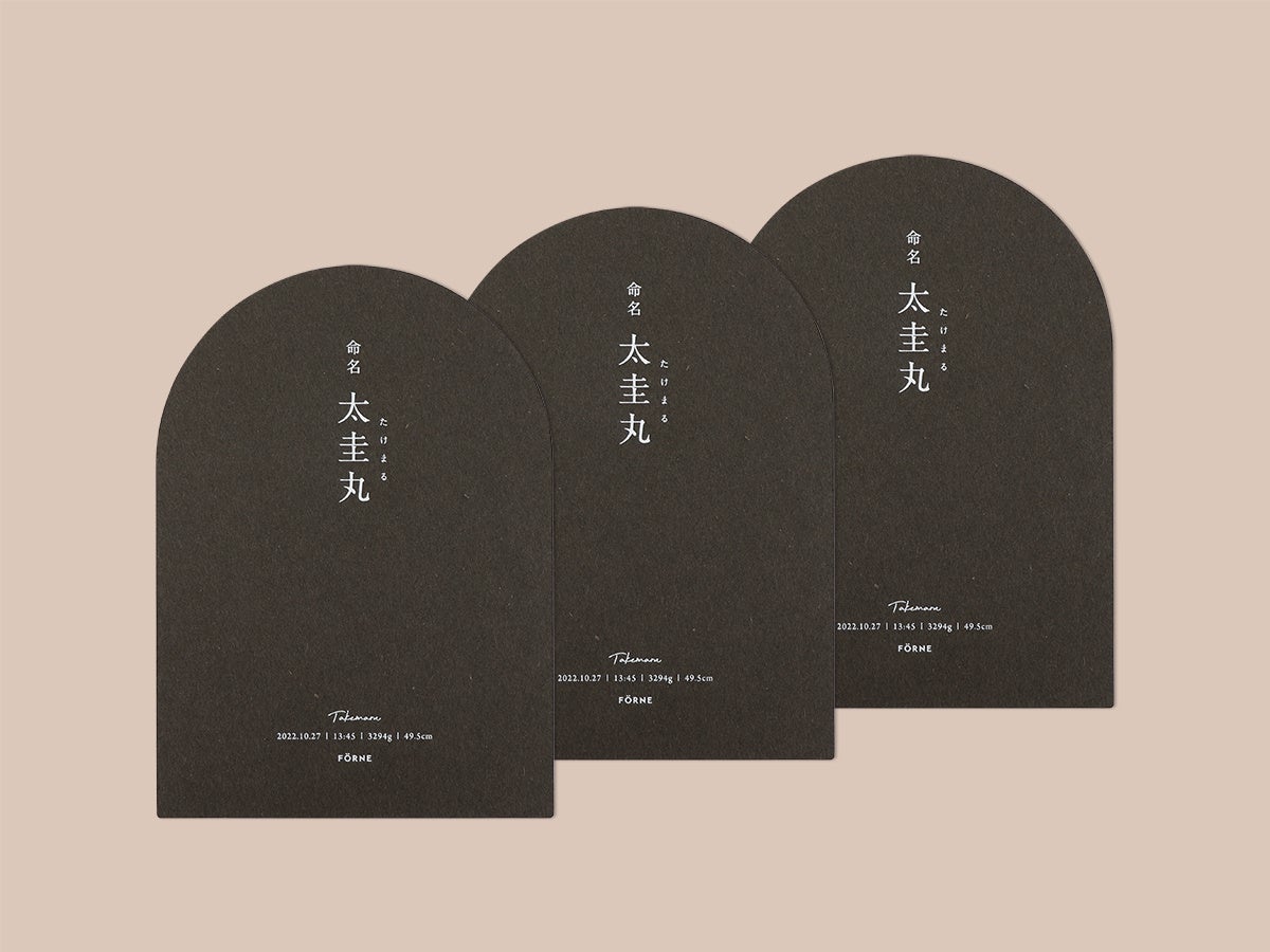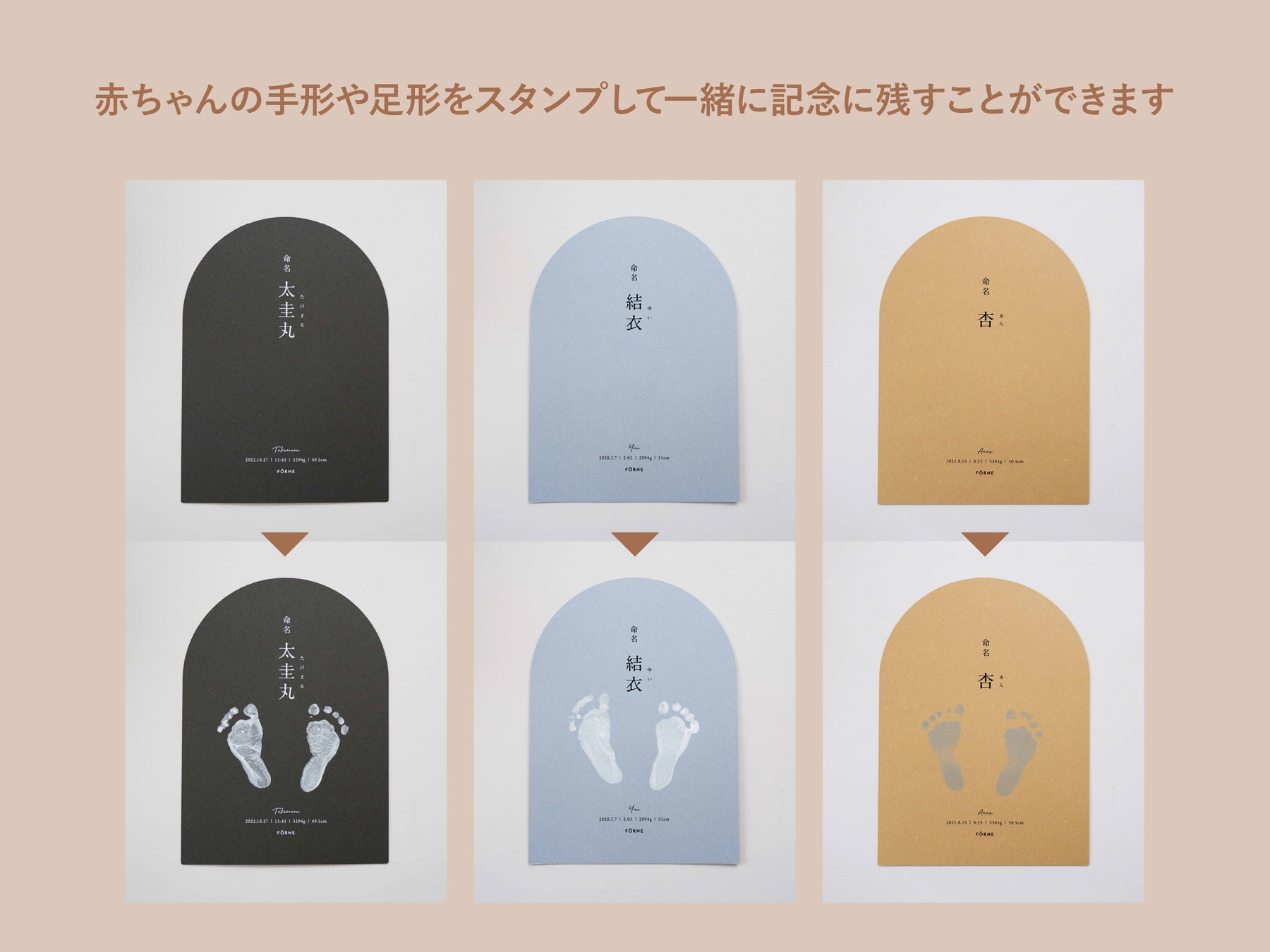 誕生した赤ちゃんの名前(漢字・ふりがな・ローマ字)、誕生日時、身長、体重を印字できる、オーダー式の「命名書」。アーチ型の台紙は部屋に置いてもなじむシンプルデザイン。お七夜などのイベント時に飾ったりニューボーンフォトを撮る際に赤ちゃんの近くに添えるのもぴったりです。