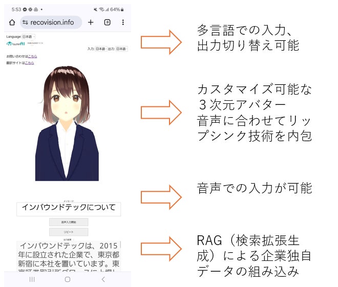この革新的なサービスは、AIと3次元アバターを連携させ、会話時に自動生成される音声から口の動きを生成する「リップシンク」技術を実装し、これにRAG※技術と生成AIを組み合わせた会話システムを融合しました。これにより、利用者と3次元アバターによる自然な対話体験を提供し、様々な分野での活用が可能となります。