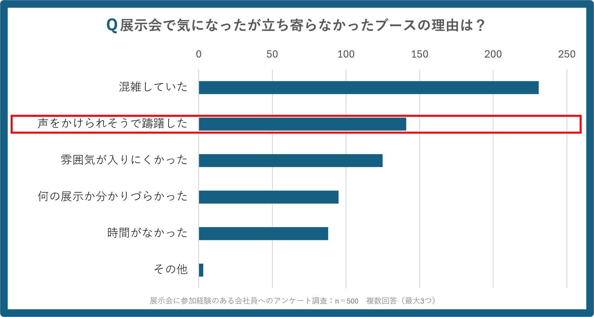ここまでの調査結果より、展示会ブースにおいて担当者の声かけがマイナス影響となるケースがあることがわかりました。