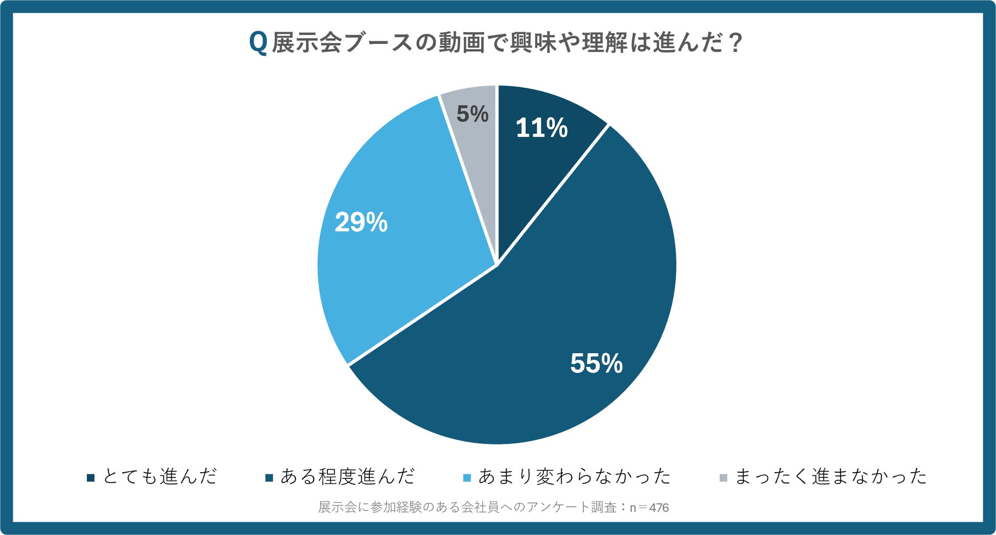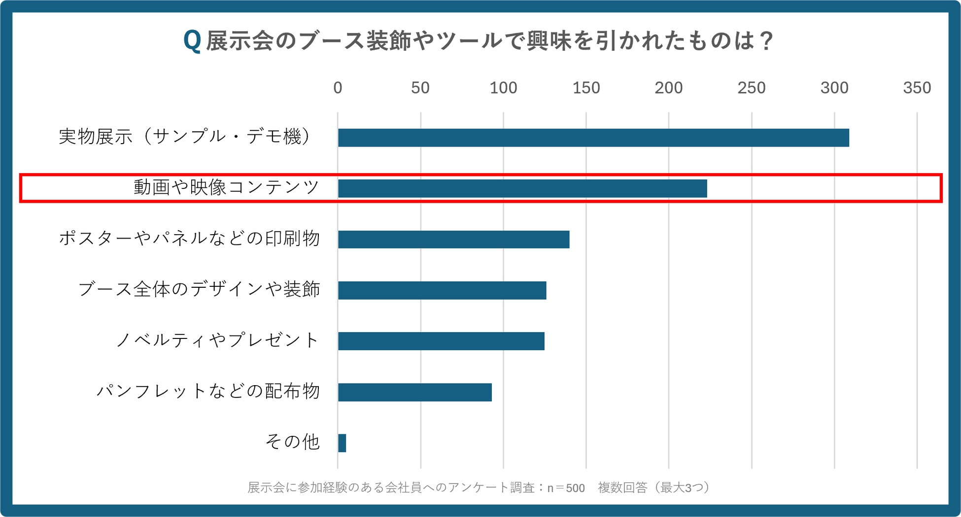 この調査結果より、展示会ブースでサービスや商品の興味や理解を深めるツールとして動画が印刷物などよりも効果的であることがわかりました。