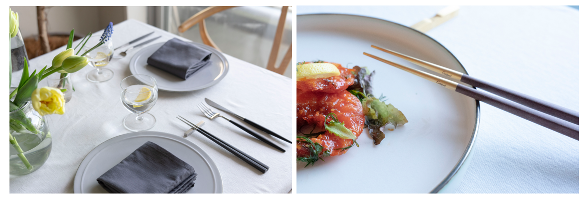 この度登場する「KUBEお箸セット」は、お箸と箸置きを組み合わせたセットで、Cutipolのナイフやフォークなどとのテーブルコーディネートを追求したデザインです。GOAシリーズの既存の丸箸に加えて、KUBEシリーズの角箸の登場により、用途や好みに合わせてお選びいただけるようになりました。角箸は面に指を添えやすく、箸先まで力が伝わりやすいのが特徴です。和洋限らず、あらゆる料理にお使いいただける「KUBEお箸セット」は、食卓をより華やかに彩ります。