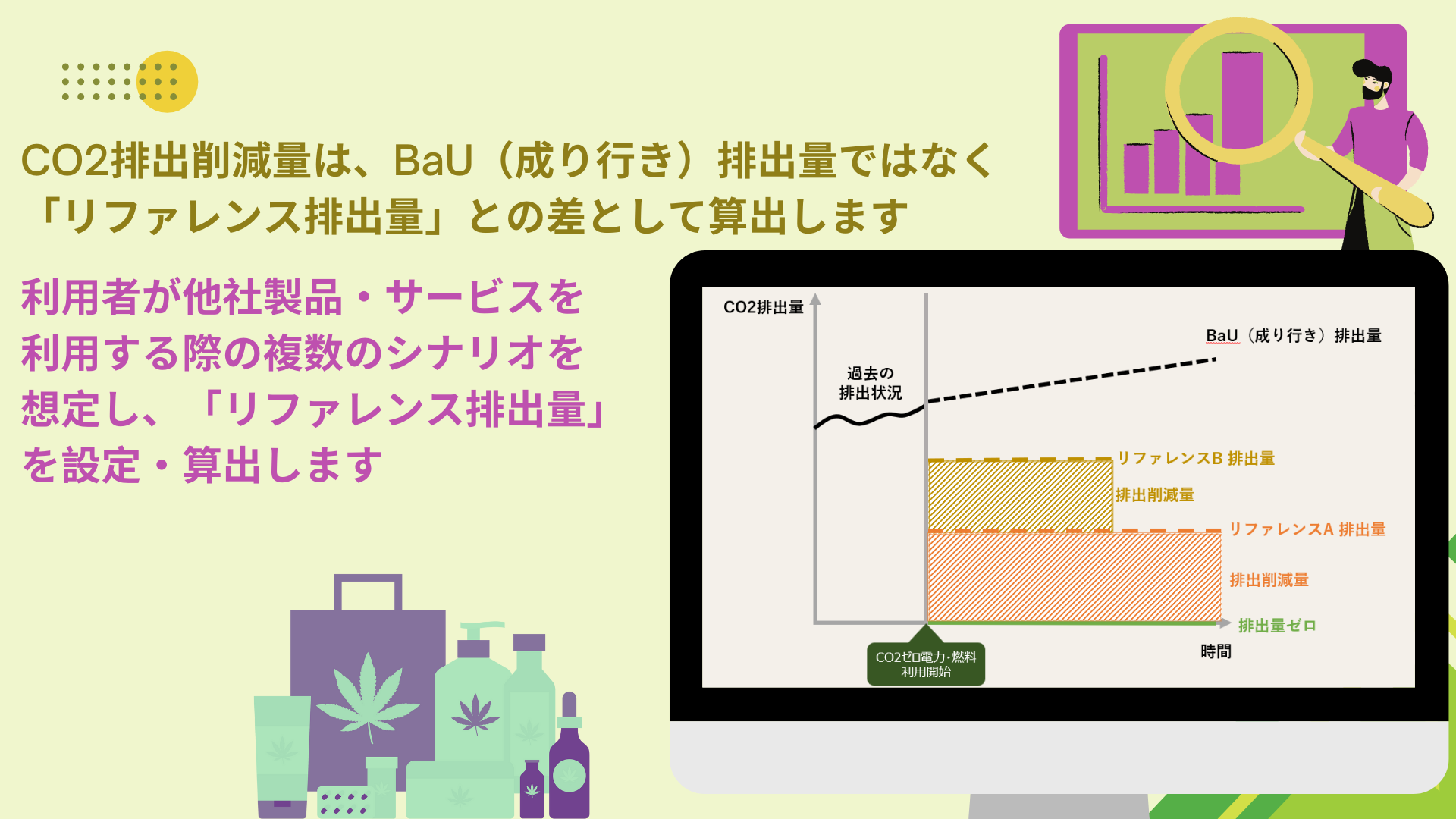 CO2ゼロ電力・燃料を導⼊し、その効果としてのCO2 排出削減量を算定する多くの場合は、CO2ゼロ電力が導入されなかった場合の排出量「BaU*(成り⾏き)排出量」との差を排出削減量として計算します。しかし、利用者視点で見た場合、CO2ゼロ電力を「導入している企業」と「導入していない企業」を比較して購買意思決定を行うことになるため、この場合の「削減量」は、他社製品・サービスの「リファレンス排出量」との差として定義すべきであると考えます。当社は、企業の事業内容や競合他社の製品・サービスに合わせ、カスタマイズした方法論を構築します。