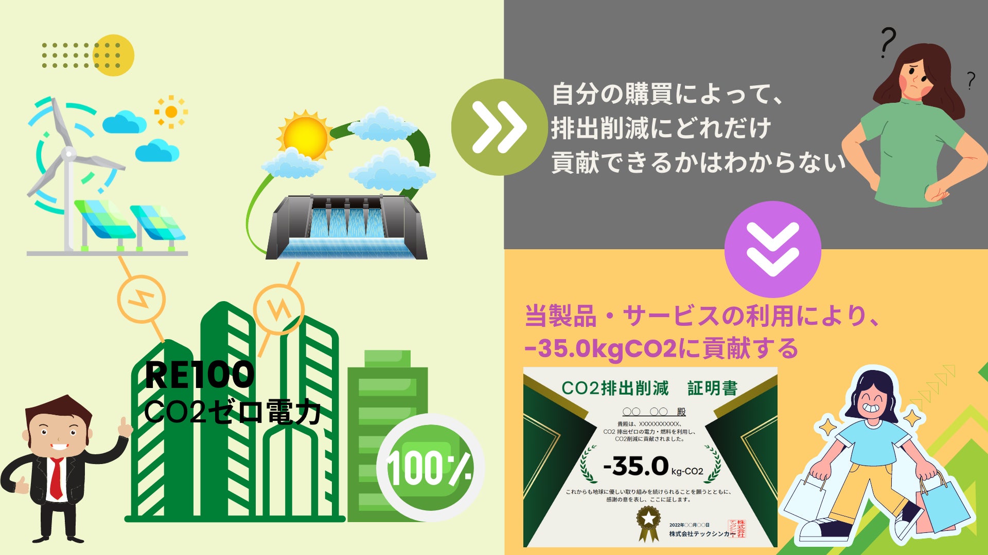 株式会社テックシンカーは、2022年11月11日、「CO2削減貢献量の算出サービス」の提供を開始いたします。近年、電気やガスなどでCO2を排出しないエネルギーや燃料を選択できるプランが導入されつつあり、特にCO2排出ゼロ電力プランは年平均成長率60%で2025年までには年間契約件数約180万件にまで急増すると予想されています。しかし、こうしたCO2ゼロ電力・燃料を導入しても、協業先や消費者にうまくそれが伝わらないと感じている企業は少なくありません。当社の「CO2削減貢献量の算出サービス」を通じて、こうしたCO2ゼロ電力・燃料の導入に際し、協業先や消費者の購買行動がどれだけCO2排出量削減に貢献したかを算出することができます。数値化による明確な情報発信により、協業先・消費者の購買意欲を高めます。