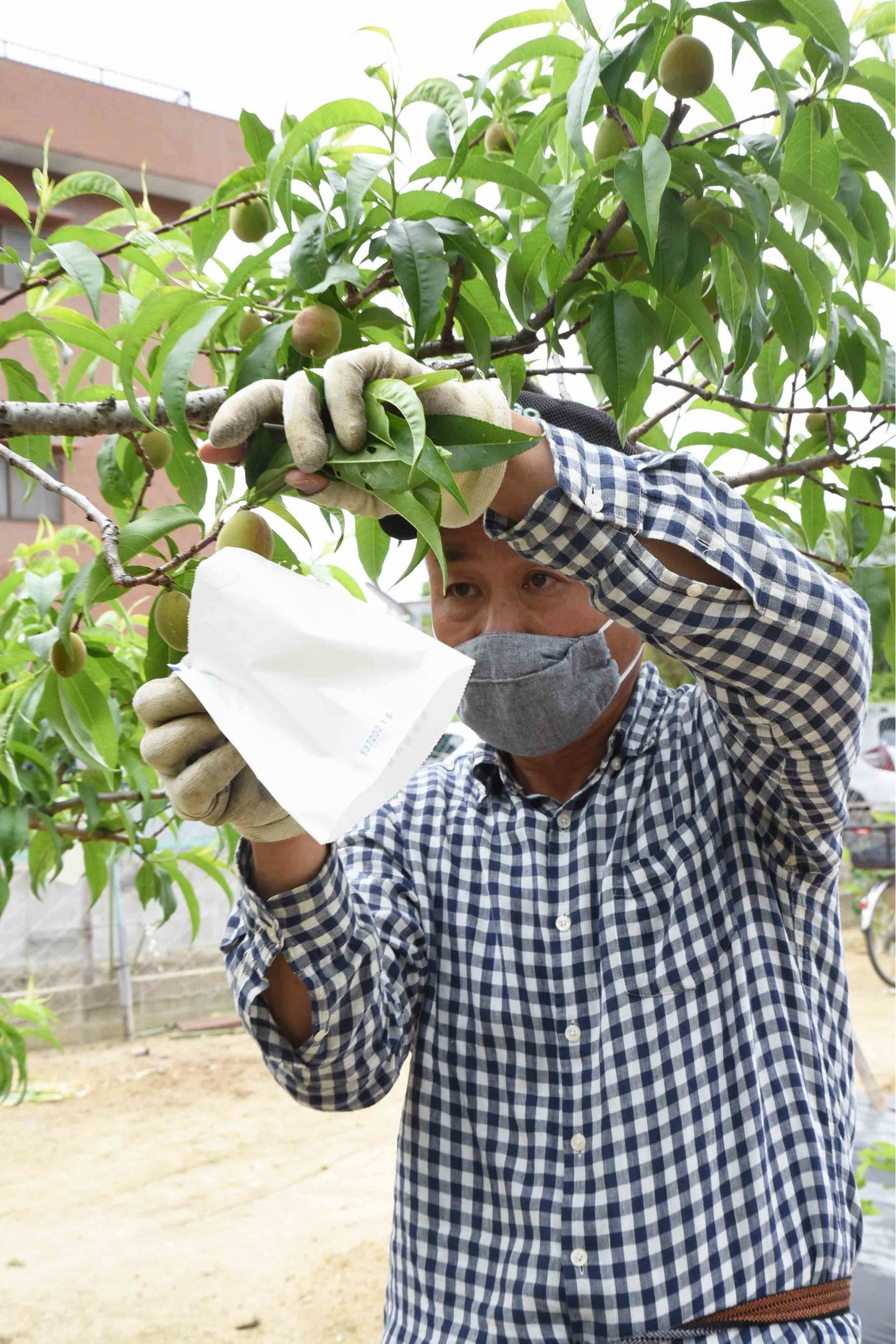 県内有数の早生桃の産地である川西市南部地区(主に加茂・南花屋敷地区)。5月中旬の今、多くの生産農家で桃の「袋かけ」の作業に入り、直径3センチほどの大きさにまで育った実一つひとつに袋を掛ける作業を行っている。収穫は6月中旬~下旬。