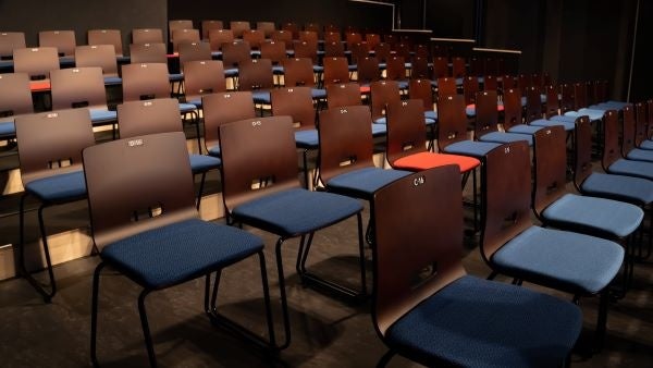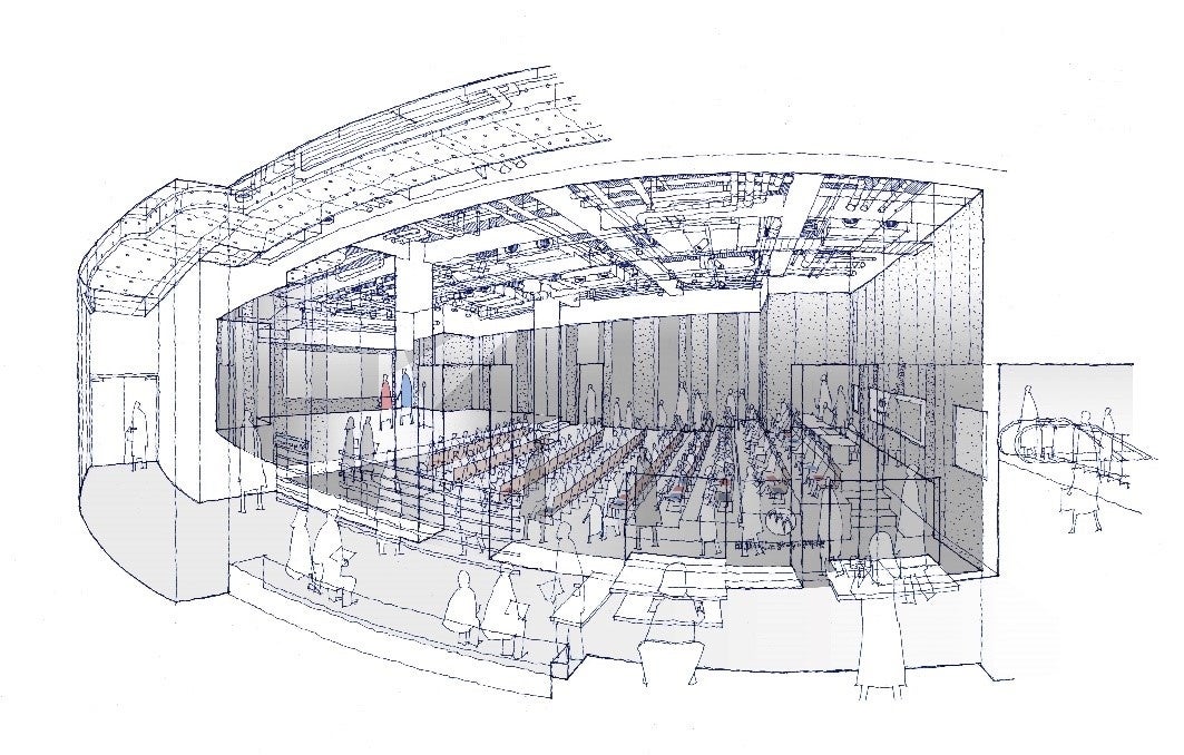 舞台と客席に一体感を感じられるような大半を黒で統一したブラックボックス空間に、高精細な大型LEDビジョンを設置。大迫力の映像と共に音響や機材のご紹介をさせていただきます。