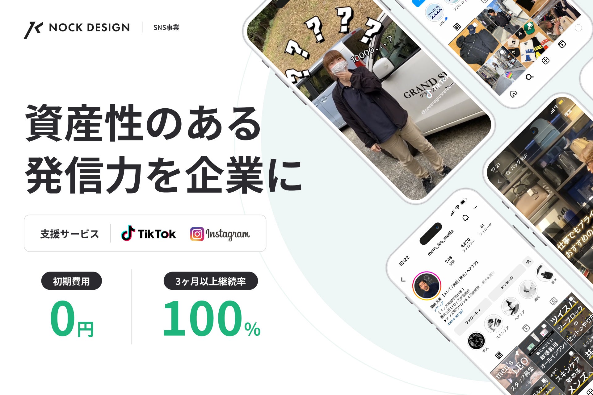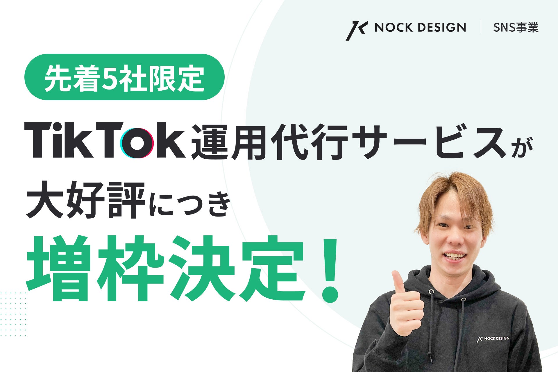 株式会社ノックデザイン(https://nock-design.com/)は、「資産性のある発信力を企業に」というテーマを掲げ、SNSをビジネス(https://nock-design.com/nichiyobi/service/tiktok)に活かしたいと考えている企業様の活動を全面的にサポートしています。その中でも今、非常に要望の多い「TikTok運用代行サービス」の半額キャンペーンを先着5社様限定で実施いたします。ぜひこの機会にお申し込みください。