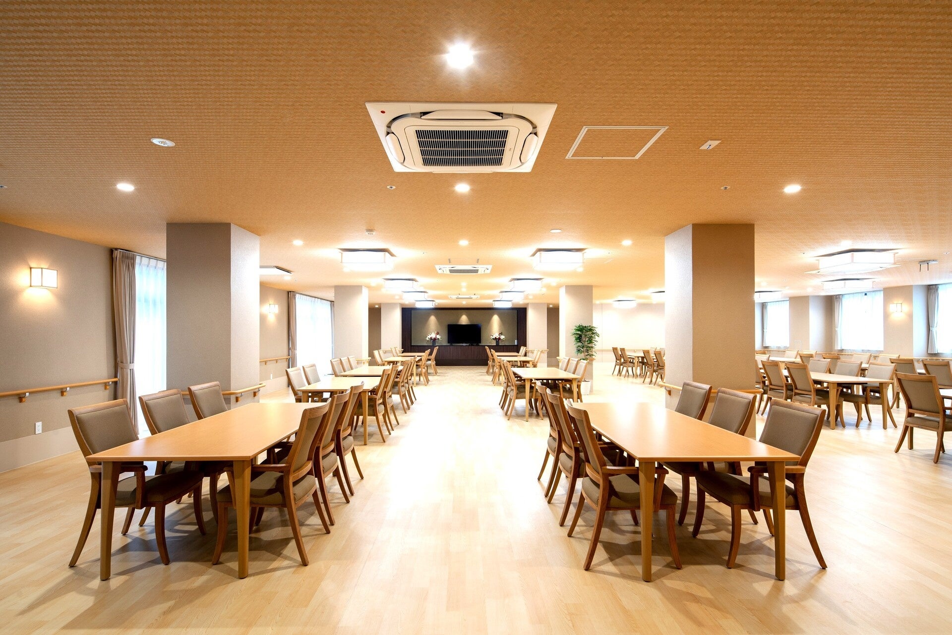 居室設備: 全室個室(広さ 18㎡)、洗浄機能付きトイレ、洗面台、介護用電動ベッド、緊急時コールボタン、室内照明、スプリンクラー、眠りSCAN(体動センサー(寝返り、呼吸、脈拍など)、必要な方に導入)