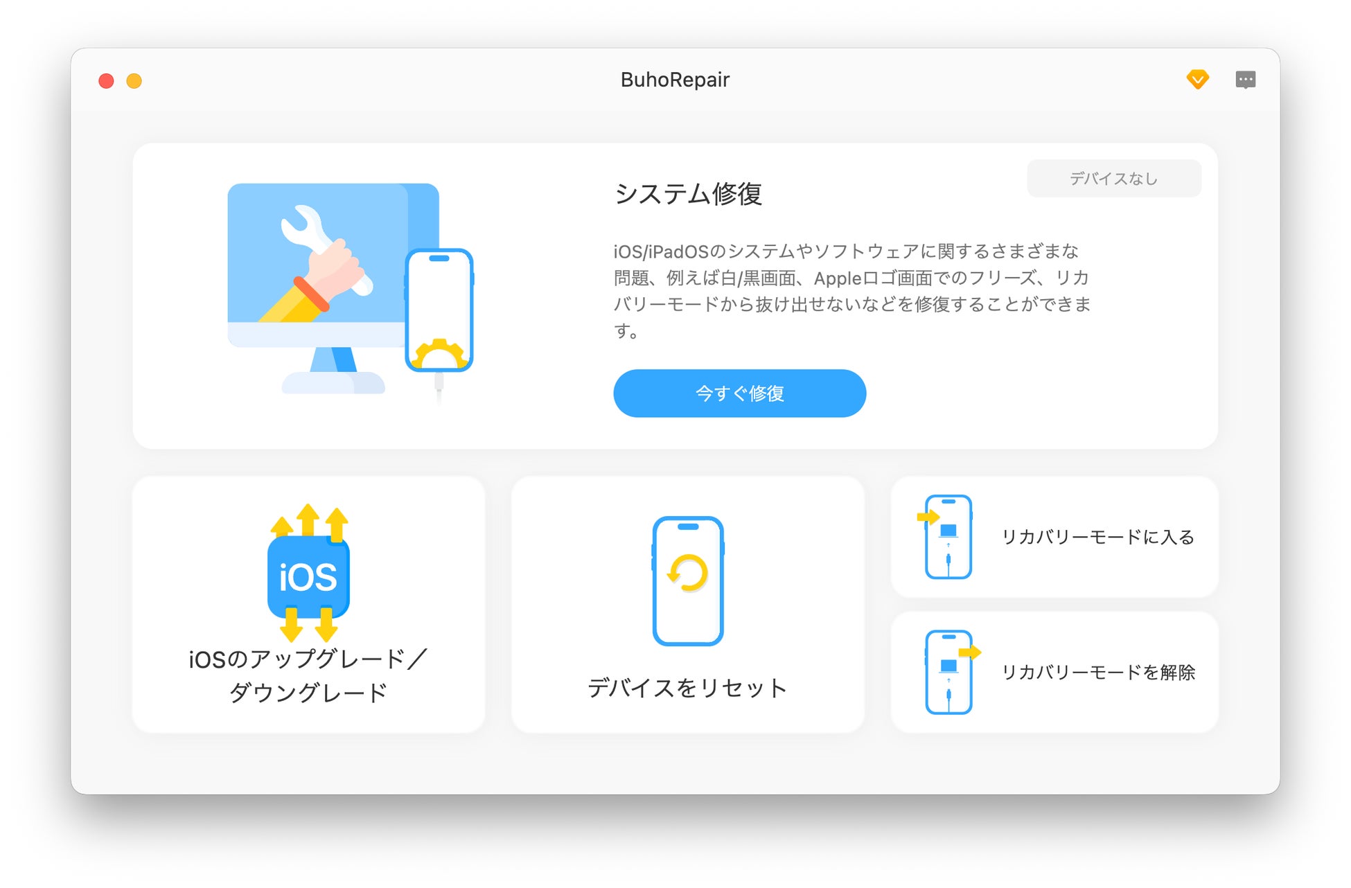 BuhoRepair は、iPhone/iPad/iPod で発生する一般的なソフトウェア不具合を 専門知識なしで修復できるツール です。起動不良やシステムエラーも数クリックで解決できます。