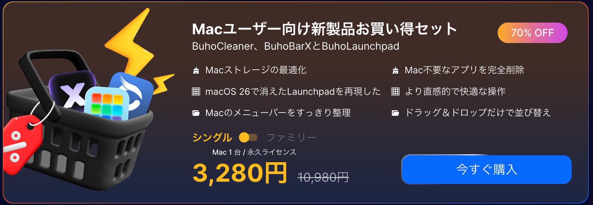 今年は定番の BuhoCleaner、BuhoNTFS に加え、macOS 26 Tahoe に最適化された新製品 BuhoLaunchpad、BuhoBarX も特別価格で提供いたします。