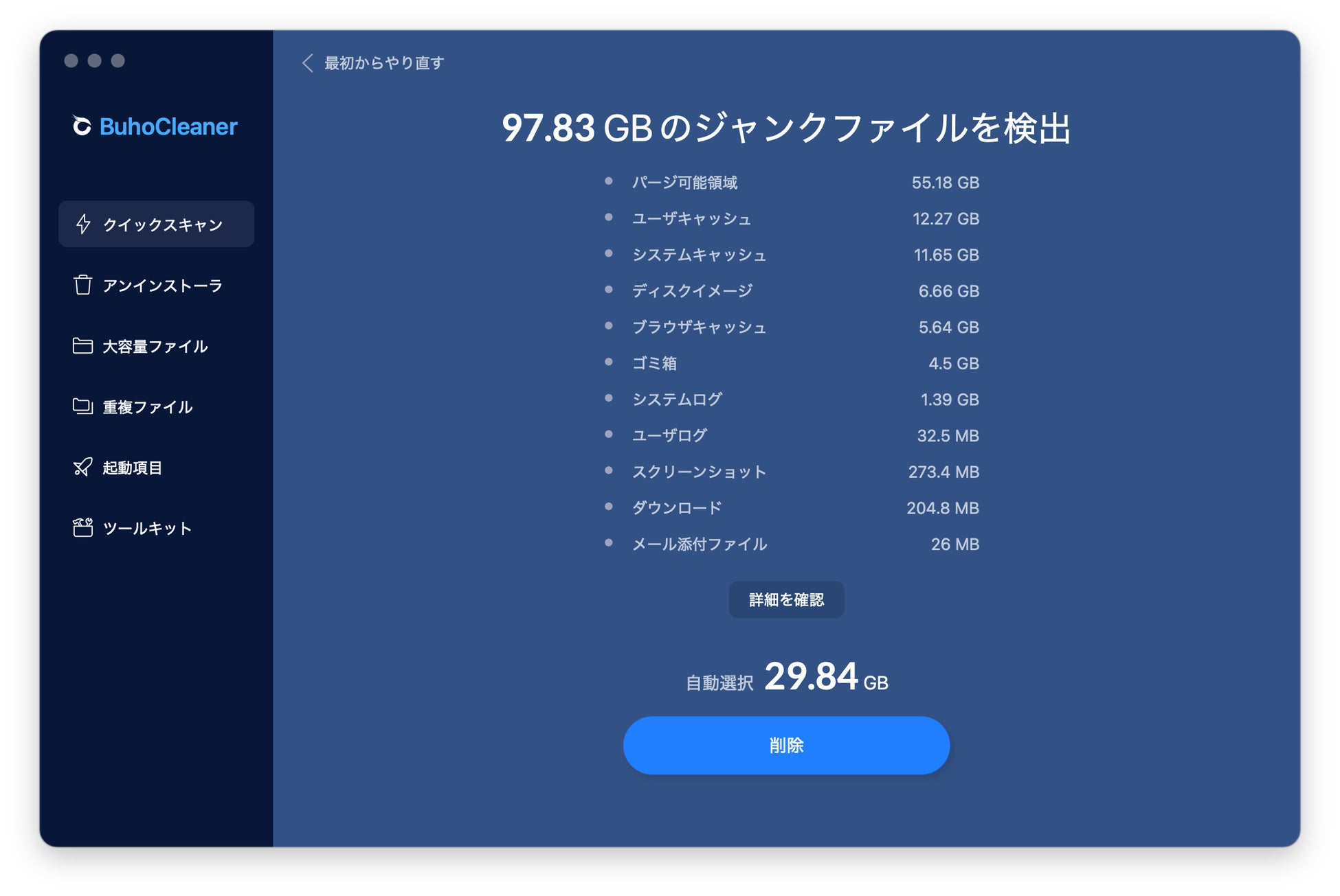 大容量の不要ファイルをワンクリックで削除